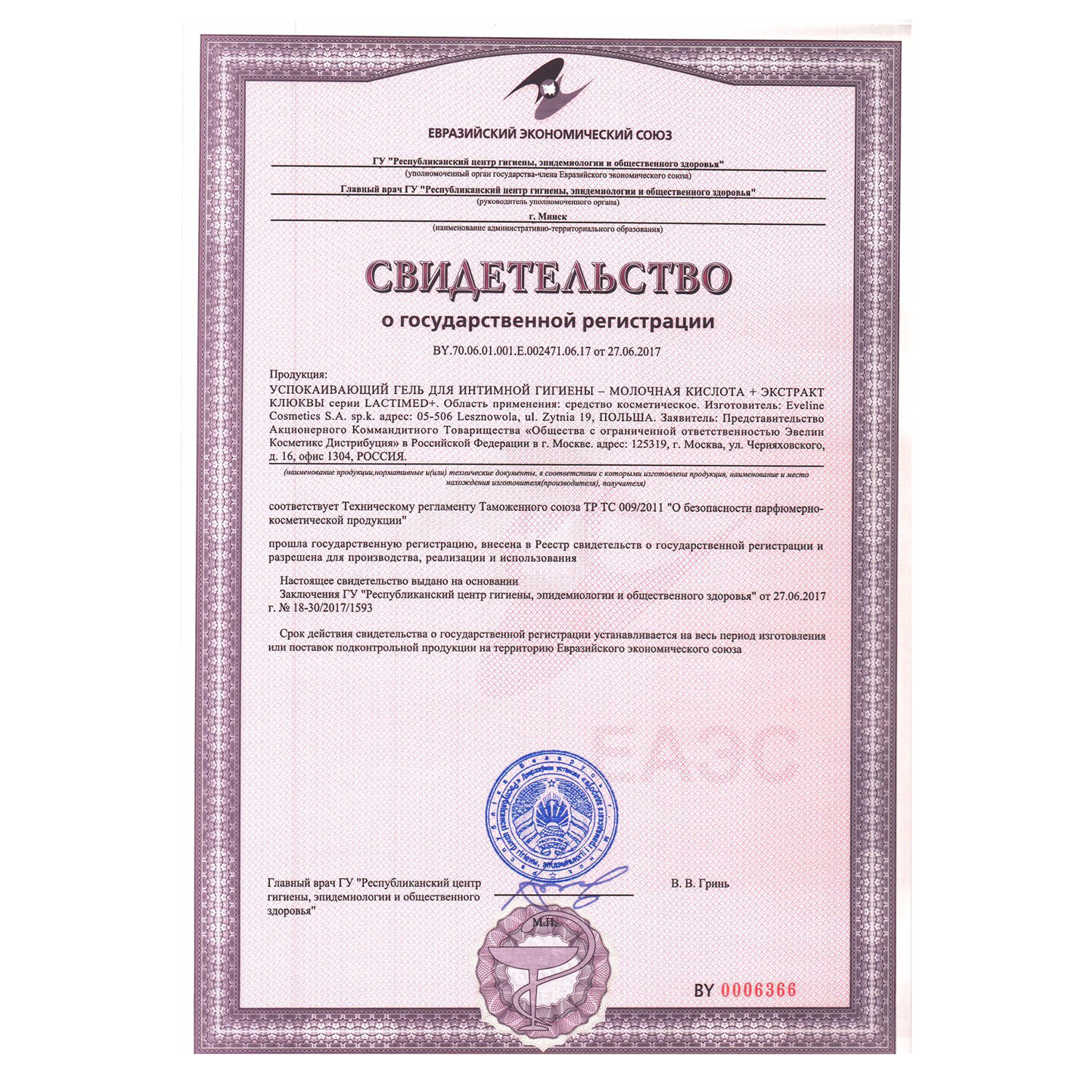Гель для интимной гигиены EVELINE LACTIMED+ успокаивающий, молочная кислота + экстракт клюквы, 250 мл