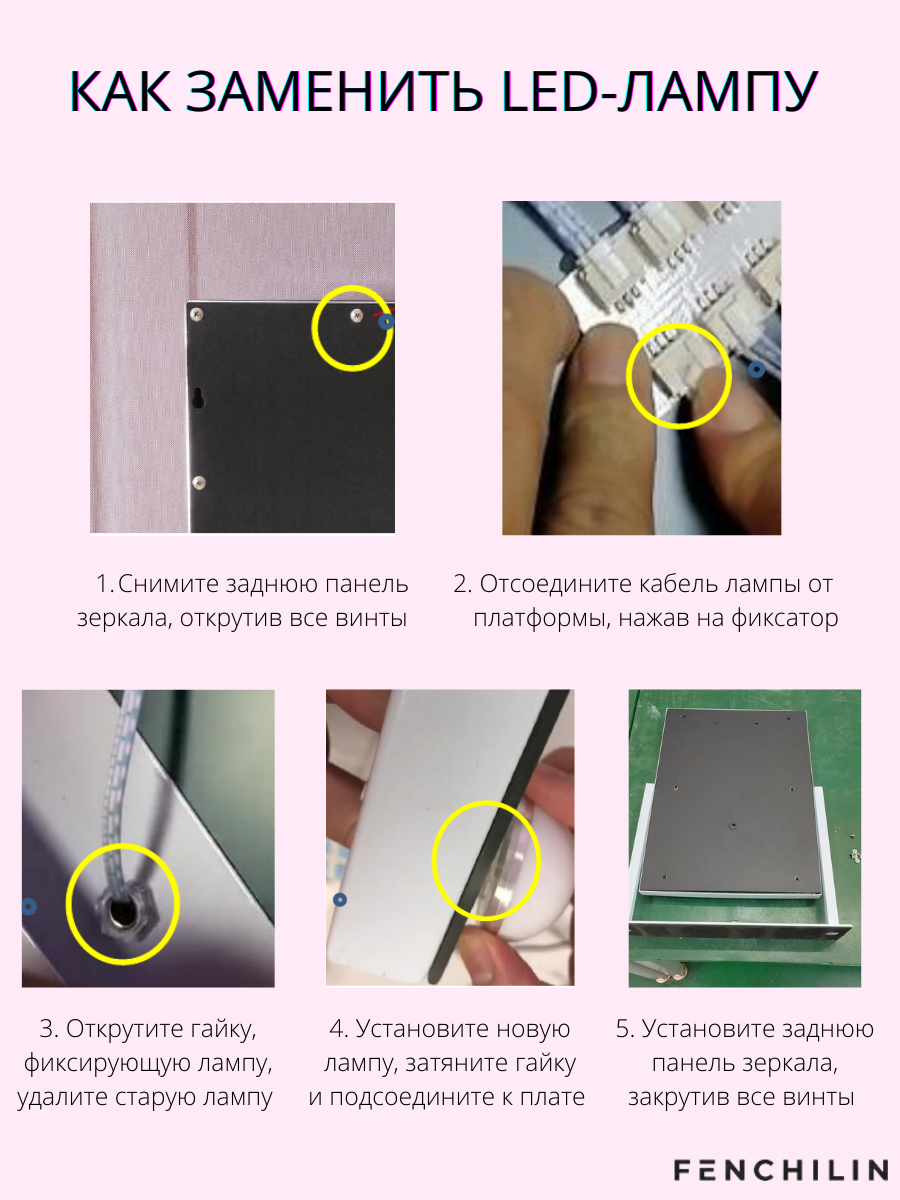 | Комплектация | зеркало со встроенными LED-лампами, увеличительное зеркало на присосках, салфетка из микрофибры, блок питания 220в |