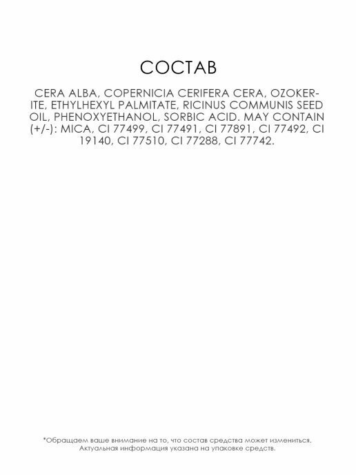| Состав | cetearyl methicone, hydrogenated palm oil, boron nitride, hydrogenated vegetable oil, hydrogenated рапса oil, винил диметикон/methicone silsesquioxane crosspolymer, japan synthetic wax, zinc stearate, альфа-токоферол, lecithin, ascorbyl palmitate, glyceryl stearate, glyceryl олеат, citric acid, triethoxycaprylylsilane +/- aluminum hydroxide |