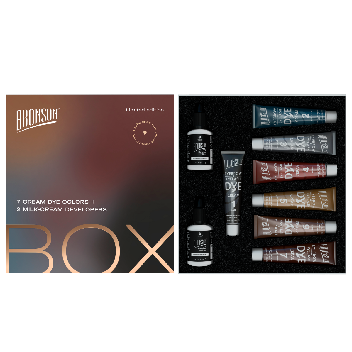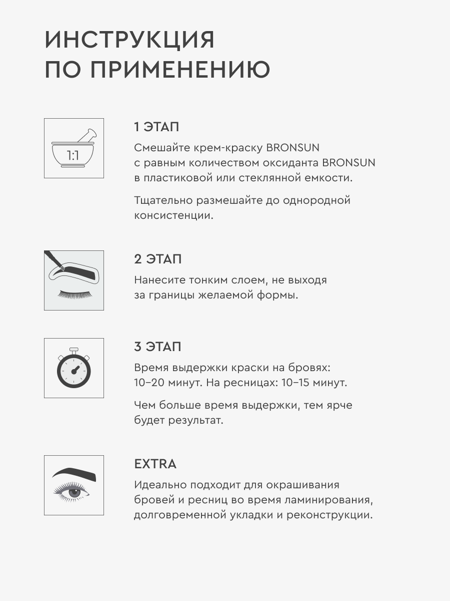 | Комплектация | Крем-краска для бровей и ресниц BRONSUN, цвет черный #1, 15 мл — 1 шт.; Крем-краска для бровей и ресниц BRONSUN, цвет иссиня-черный #2, 15 мл — 1 шт.; Крем-краска для бровей и ресниц BRONSUN, цвет графит #3, 15 мл — 1 шт.; Крем-краска для бровей и ресниц BRONSUN, цвет каштан #4, 15 мл — 1 шт.; Крем-краска для бровей и ресниц BRONSUN, цвет светло-коричневый #5, 15 мл — 1 шт.; Крем-краска для бровей и ресниц BRONSUN, цвет коричневый #6, 15 мл — 1 шт.; Крем-краска для бровей и ресниц BRONSUN, цвет темно-коричневый #7, 15 мл — 1 шт.; Оксидант-молочко BRONSUN 3%, 20 мл — 2 шт. Инструкция — 1 шт. |