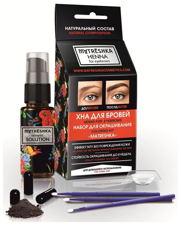 | Дополнительная информация | набор рассчитан на 5 применений; в состав набора входит: хна в капсулах 5 шт. одного цвета, пластиковый контейнер для разведения хны, минеральный раствор для разведения хны, микро браши для нанесения хны |