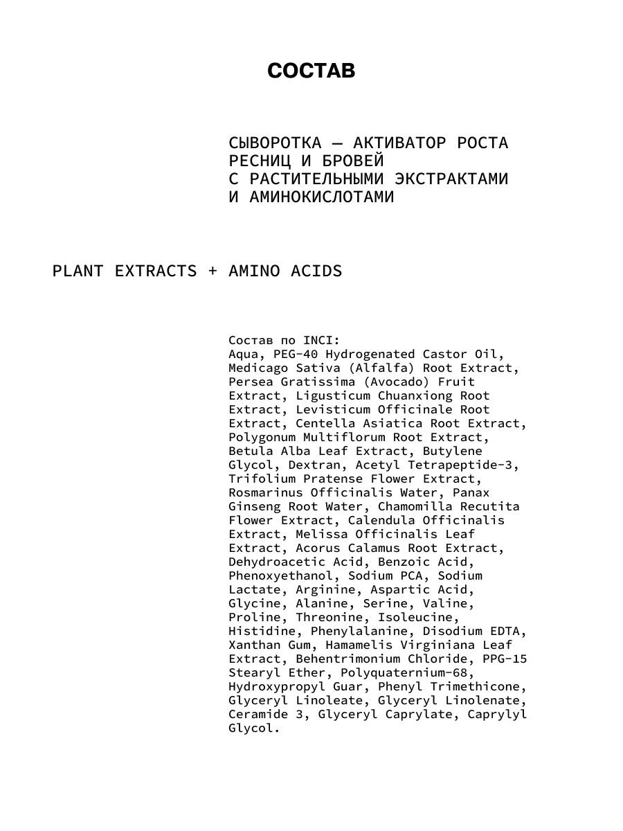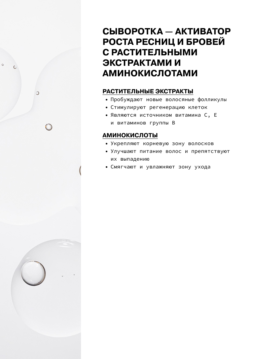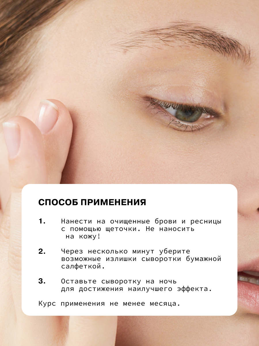 | Способ применения | нанести на очищенные брови и ресницы с помощью щеточки, не наносить на кожу! через несколько минут уберите возможные излишки сыворотки бумажной салфеткой, оставьте сыворотку на ночь для достижения наилучшего эффекта |