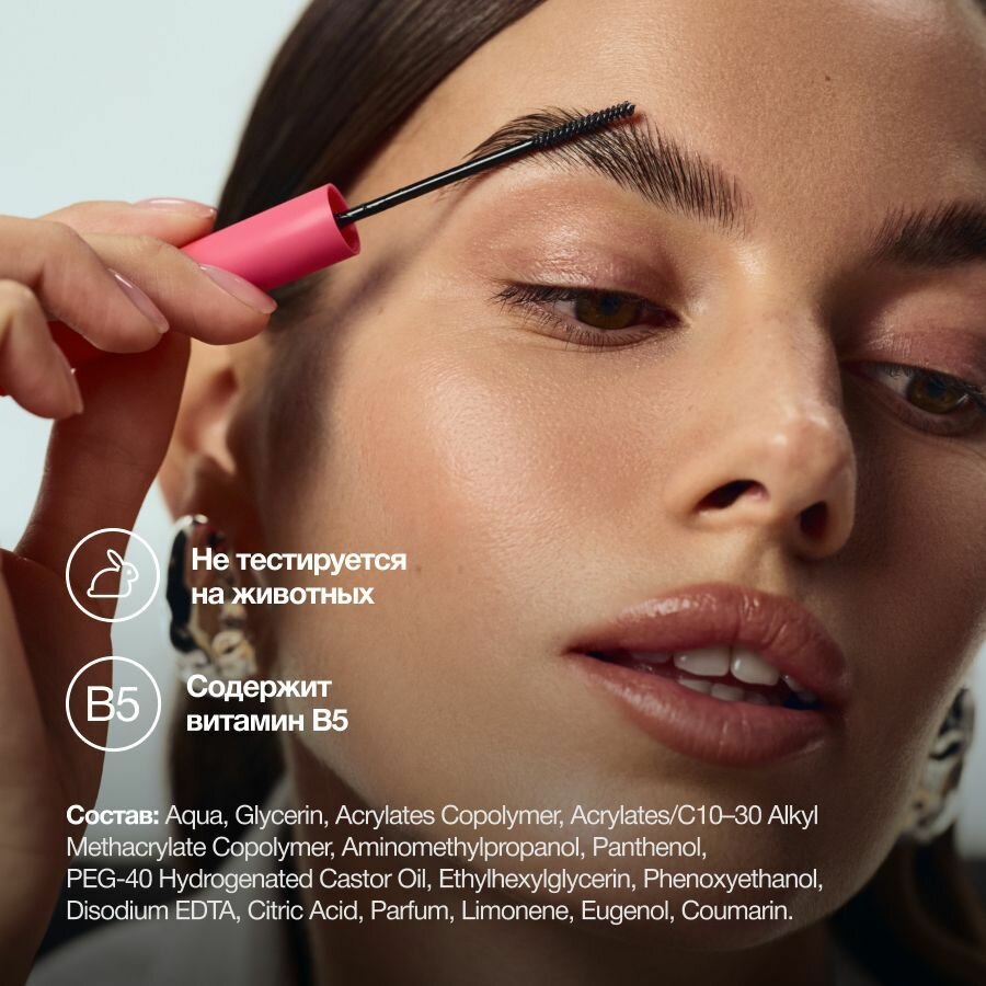 | Способ применения | нанесите небольшое количество геля на брови, зачесывая легкими движениями волоски наверх у основания брови и по направлению роста волос ближе к кончику. Для более интенсивной фиксации: нанесите гель, прочесывая брови вниз. Придайте бровям необходимую форму, зачесывая волоски наверх у основания и по направлению роста волос ближе к кончику |