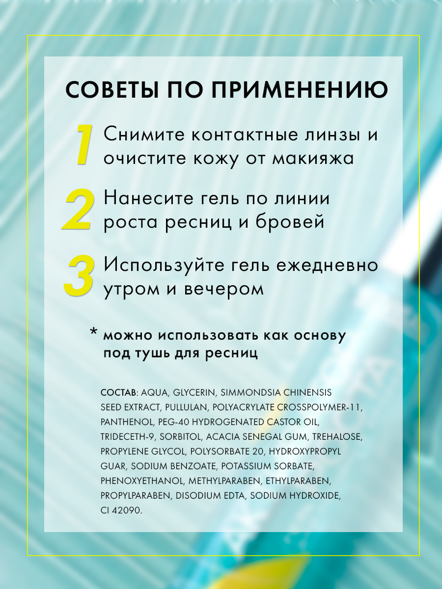 | Способ применения | Снимите контактные линзы и очистите кожу от макияжа. Нанесите гель по линии роста ресниц и бровей. Используйте гель ежедневно утром и вечером. Гель для бровей и ресниц можно также использовать как основу под тушь. Она обволакивает каждую ресничку, делая ее более плотной. |