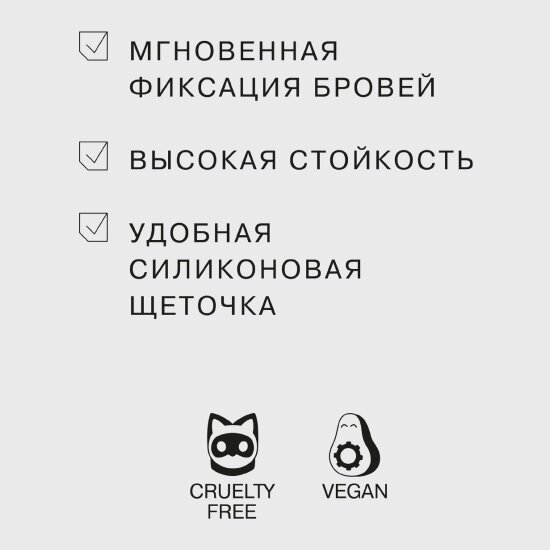 | Способ применения | наносите щеточкой. Уберите излишки геля с щеточки и расчешите брови, создавая любую форму бровей. Для более сильной фиксации нанесите сначала один слой геля, подождите минуту и затем нанесите второй слой геля |