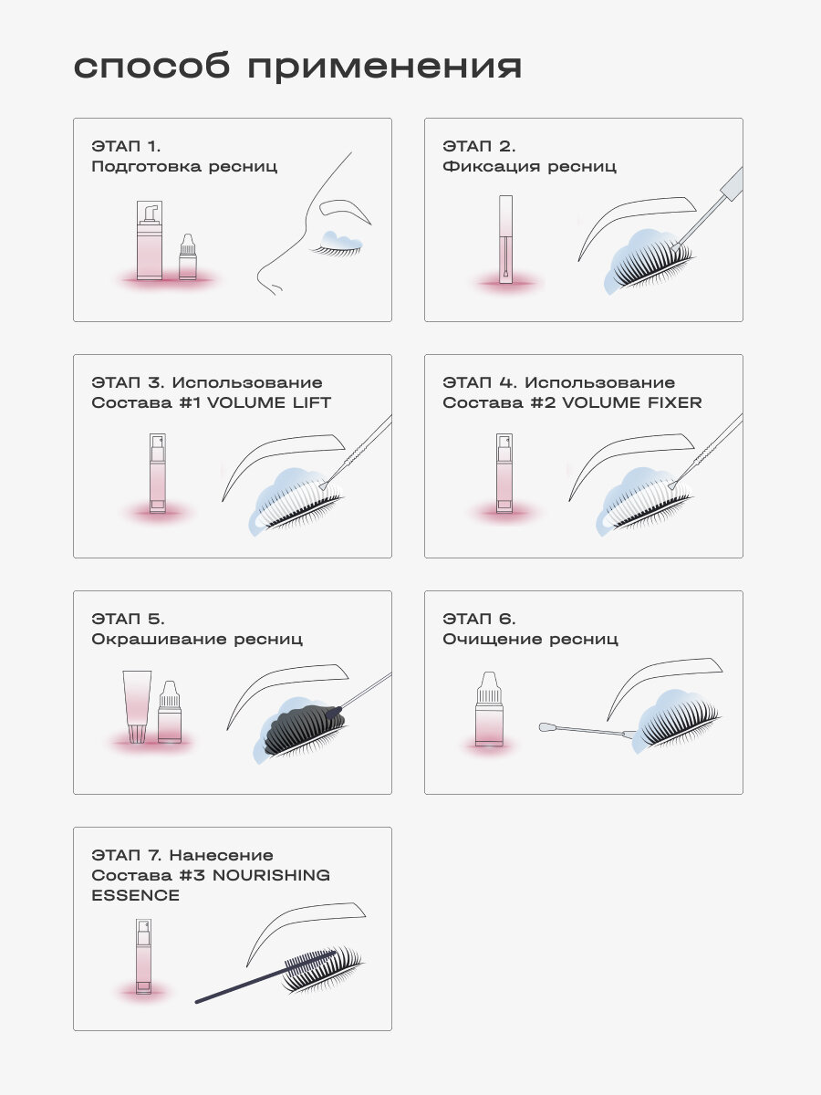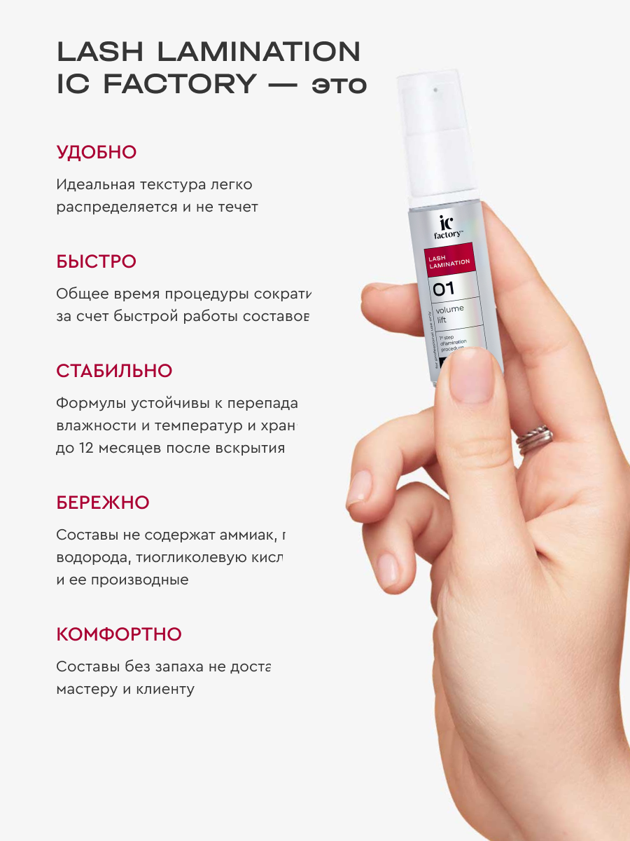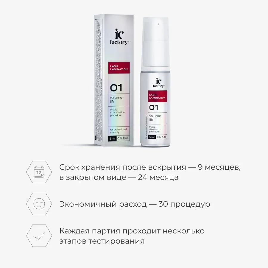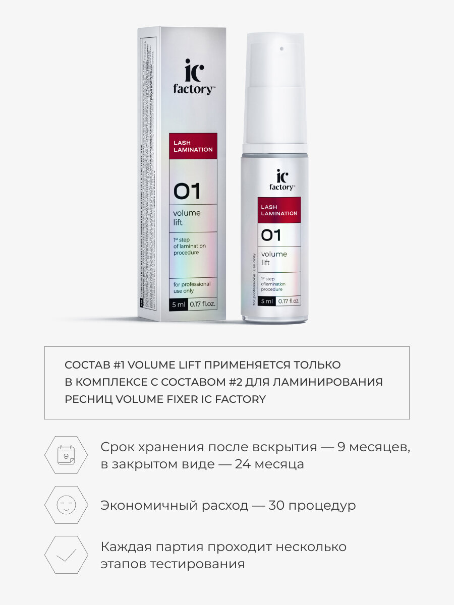 | Дополнительная информация | Только для профессионального применения. Перед применением проведите тест на чувствительность. При возникновении аллергической реакции обратитесь к врачу. Избегать попадания в глаза, в случае попадания в глаза немедленно промыть. Перед процедурой снимите контактные линзы. При попадании составов на линзы: сначала удалить линзы из глаз, затем немедленно промыть глаза большим количеством воды. При необходимости обратитесь к врачу. Состав #1 для ламинирования ресниц VOLUME LIFT IC FACTORY содержит щелочь. Избегать попадания в глаза, в случае попадания в глаза немедленно промыть. Может вызвать слепоту. Хранить в местах, недоступных для детей. Не использовать в целях, отличных от прямого назначения продукта. Соблюдайте инструкцию. |