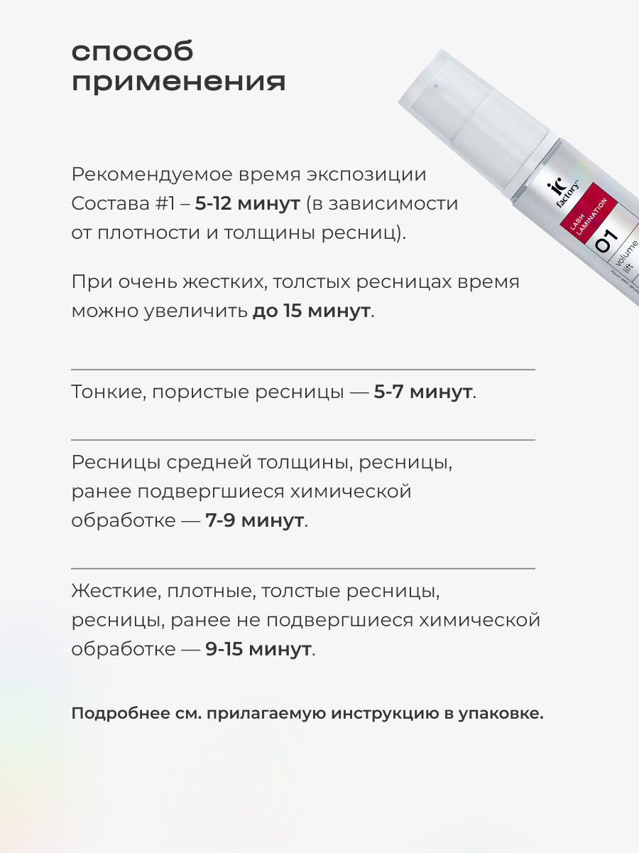 | Способ применения | Рекомендуемое время экспозиции Состава #1 5-12 минут (в зависимости от плотности и толщины ресниц). При очень жестких, толстых ресницах время можно увеличить до 15 минут. - Тонкие, пористые ресницы — 5-7 минут; - Ресницы средней толщины, ресницы, ранее подвергшиеся химической обработке — 7-9 минут; - Жесткие, плотные, толстые ресницы, ресницы, ранее не подвергшиеся химической обработке — 9-15 минут. Подробнее см. прилагаемую инструкцию в упаковке. |