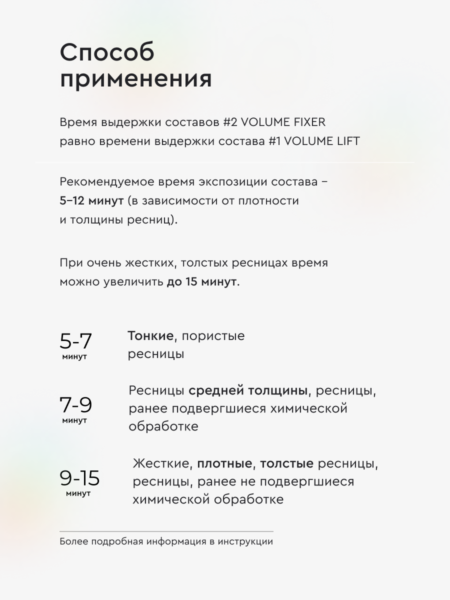 | Способ применения | Рекомендуемое время экспозиции Состава #1 5-12 минут (в зависимости от плотности и толщины ресниц). При очень жестких, толстых ресницах время можно увеличить до 15 минут. - Тонкие, пористые ресницы — 5-7 минут; - Ресницы средней толщины, ресницы, ранее подвергшиеся химической обработке — 7-9 минут; - Жесткие, плотные, толстые ресницы, ресницы, ранее не подвергшиеся химической обработке — 9-15 минут. Подробнее см. прилагаемую инструкцию в упаковке. |