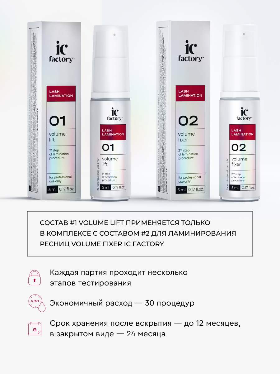 | Дополнительная информация | Только для профессионального применения. Перед применением проведите тест на чувствительность. При возникновении аллергической реакции обратитесь к врачу. Избегать попадания в глаза, в случае попадания в глаза немедленно промыть. Перед процедурой снимите контактные линзы. При попадании составов на линзы: сначала удалить линзы из глаз, затем немедленно промыть глаза большим количеством воды. При необходимости обратитесь к врачу. Состав #1 для ламинирования ресниц VOLUME LIFT IC FACTORY содержит щелочь. Избегать попадания в глаза, в случае попадания в глаза немедленно промыть. Может вызвать слепоту. Хранить в местах, недоступных для детей. Не использовать в целях, отличных от прямого назначения продукта. Соблюдайте инструкцию. |