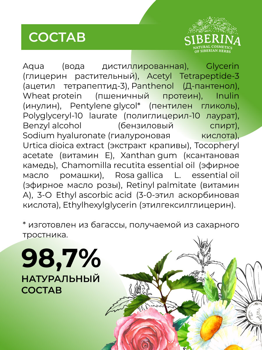 | Состав | Вода дистиллированная (Aqua), глицерин растительный (Glycerin), Д-пантенол (Panthenol), пшеничный протеин (Wheat protein), инулин (Inulin), пентилен гликоль* (Pentylene glycol), полиглицерил-10 лаурат (Polyglyceryl-10 laurate), бензиловый спирт (Benzyl alcohol), гиалуронат натрия (Sodium hyaluronate), экстракт крапивы (Urtica dioica extract), витамин Е (Tocopherol), ксантановая камедь (Xanthan gum), эфирное масло ромашки (Chamomilla recutita essential oil), эфирное масло розы (Rosa gallica L. essential oil), витамин А (Retinyl palmitate), 3-0-этил аскорбиновая кислота (3-O Ethyl ascorbic acid), этилгексилглицерин (Ethylhexylglycerin). |