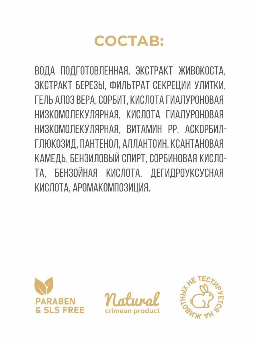 | Состав | вода подготовленная, экстракт живокоста, экстракт березы, фильтрат секреции улитки, гель алоэ вера, сорбит, кислота гиалуроновая низкомолекулярная, витамин РР, аскорбилглюкозид, пантенол, аллантоин, ксантановая камедь, бензиловый спирт, сорбиновая кислота, бензойная кислота, дегидроуксусная кислота, аромакомпозиция. |