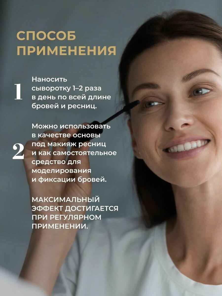 | Способ применения | наносить сыворотку 1-2 раза в день по всей длине бровей и ресниц. Можно использовать в качестве основы под макияж ресниц и как самостоятельное средство для моделирования и фиксации бровей |