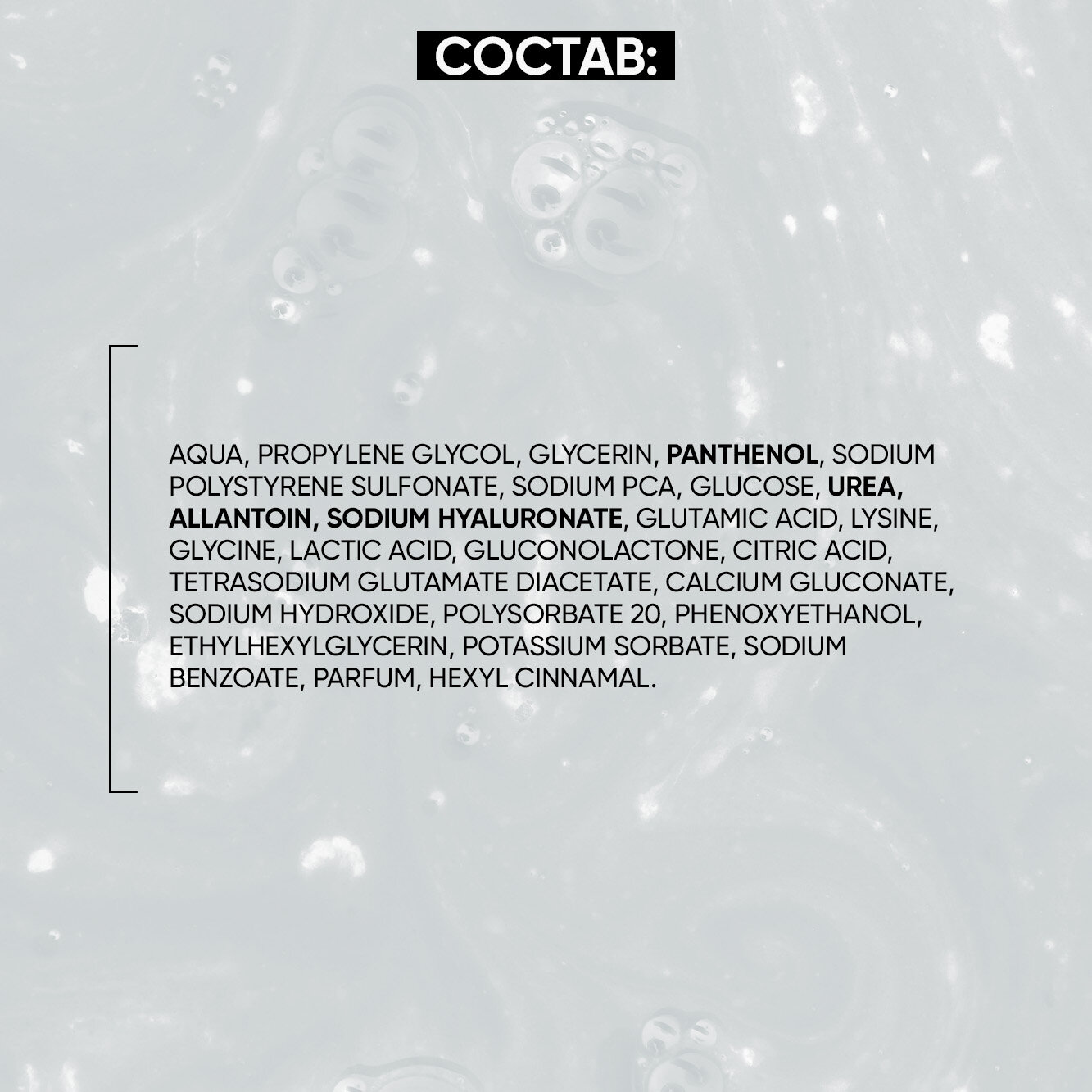 | Состав | AQUA, PROPYLENE GLYCOL, GLYCERIN, PANTHENOL, SODIUM POLYSTYRENE SULFONATE, SODIUM PCA, GLUCOSE, UREA, ALLANTOIN, SODIUM HYALURONATE, GLUTAMIC ACID, LYSINE, GLYCINE, LACTIC ACID, GLUCONOLACTONE, CITRIC ACID, TETRASODIUM GLUTAMATE DIACETATE, CALCIUM GLUCONATE, SODIUM HYDROXIDE, POLYSORBATE 20, PHENOXYETHANOL, ETHYLHEXYLGLYCERIN, POTASSIUM SORBATE, SODIUM BENZOATE, PARFUM, HEXYL CINNAMAL |