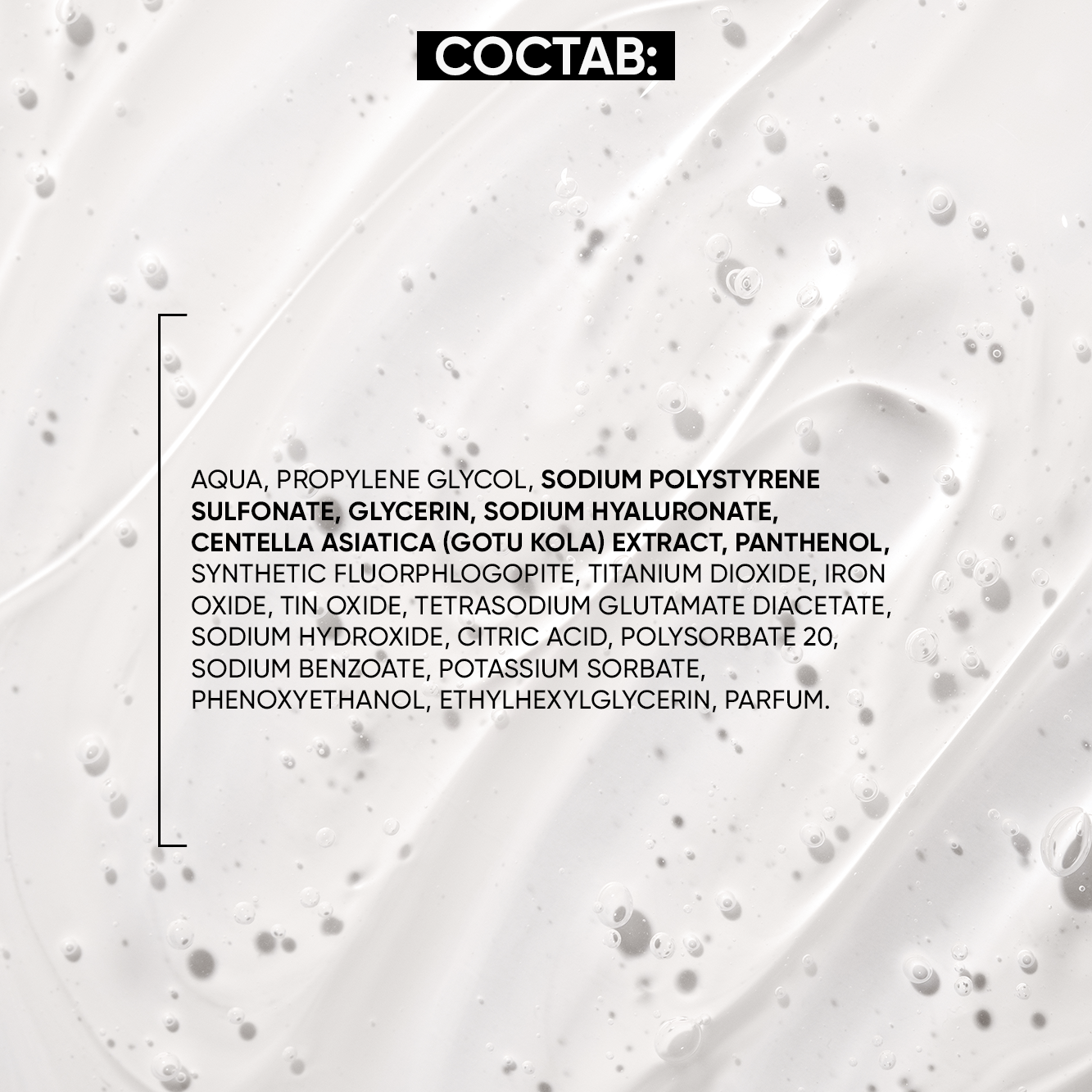 | Состав | AQUA, PROPYLENE GLYCOL, SODIUM POLYSTYRENE SULFONATE, GLYCERIN, SODIUM HYALURONATE, CENTELLA ASIATICA (GOTU KOLA) EXTRACT, PANTHENOL, SYNTHETIC FLUORPHLOGOPITE, TITANIUM DIOXIDE, IRON OXIDE, TIN OXIDE, TETRASODIUM GLUTAMATE DIACETATE, SODIUM HYDROXIDE, CITRIC ACID, POLYSORBATE 20, SODIUM BENZOATE, POTASSIUM SORBATE, PHENOXYETHANOL, ETHYLHEXYLGLYCERIN , PARFUM. |