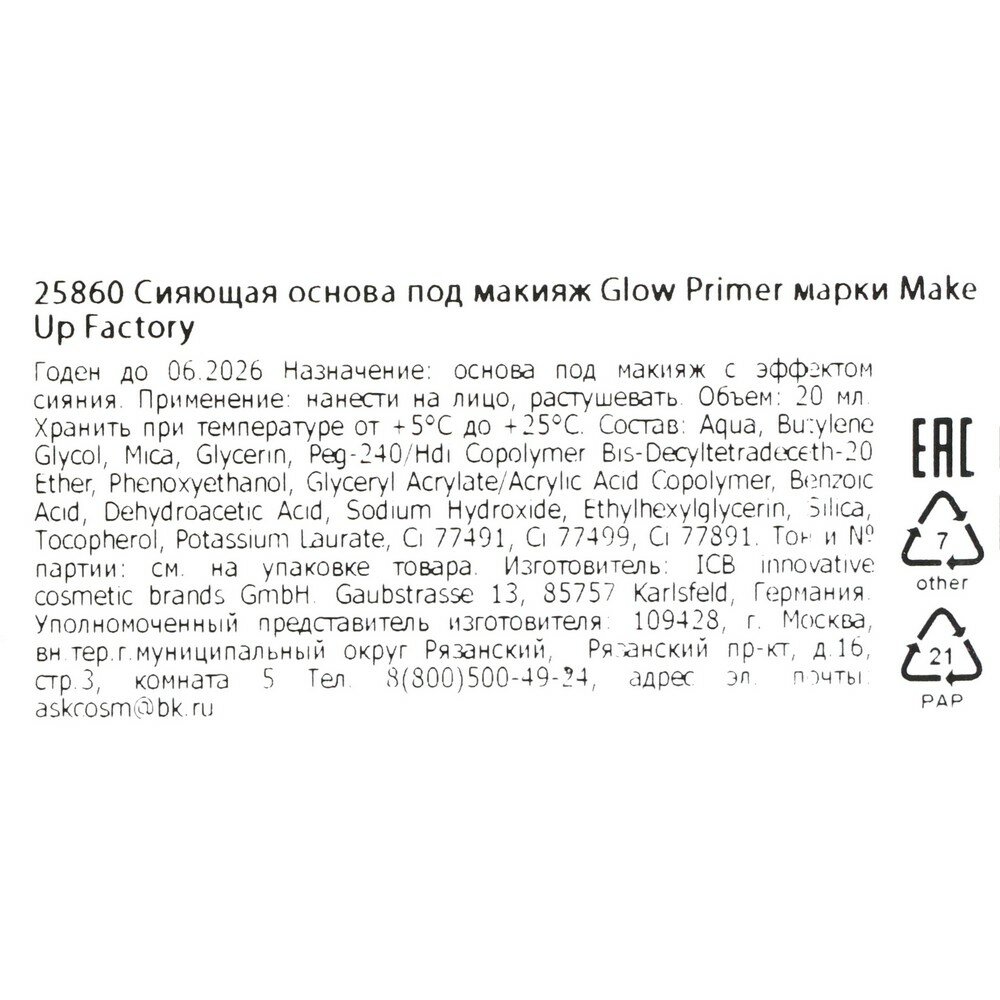 Make up Factory Сияющая основа под макияж Glow Primer 20мл интересное: