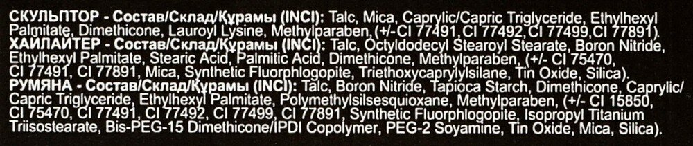 | Состав | cкульптор: talc, mica, dimethicone, caprylic/capric triglyceride, ethylhexyl palmitate, lauroyl lysine, methylparaben, (+/- ci 77491, ci 77492, ci 77499, ci 77891). хайлайтер: talc, octyldodecyl stearoyl stearate, boron nit, ethylhexyl palmitate, stearic acid, palmitic acid, methylparaben, dimethicone, (+/- ci 75470, ci 77491, ci 77891, mica, synthetic fluorphlogopite, tin oxide, triethoxycaprylylsilane, silica). румяна: talc, boron nitride, tapioca starch, dimethicone, caprylic/capric triglyceride, ethylhexyl palmitate, polymethylsilsesquioxane, methylparaben, (+/- ci 15850, ci 75470, ci 77491, ci 77492, ci 77499, ci 77891, isopropyl titanium triisostearate, bis-peg-15 dimethicone/ipdi copolymer, peg-2 soyamine, mica, silica, synthetic fluorphlogopite, tin oxide) |