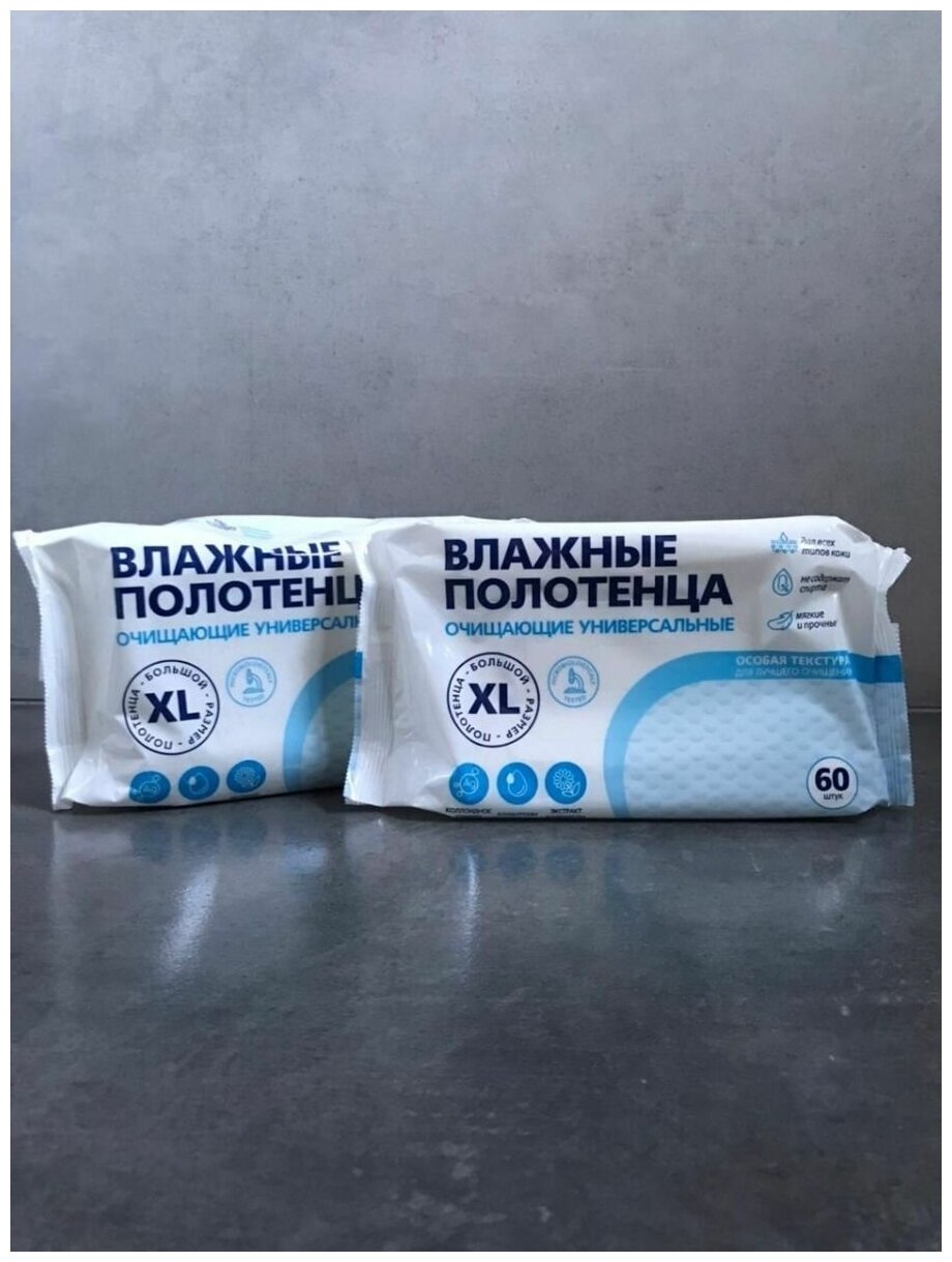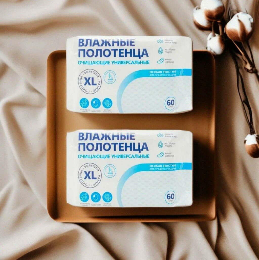 Влажные салфетки ( полотенца) очищающие, большой размер XL (2 упаковки по 60 шт.)