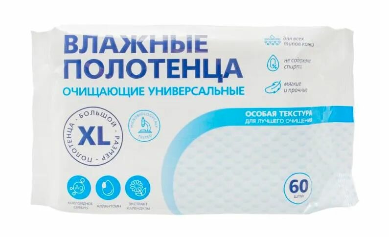 Влажные полотенца XL, универсальные без спирта, размер салфетки 28*17 см, 60 шт