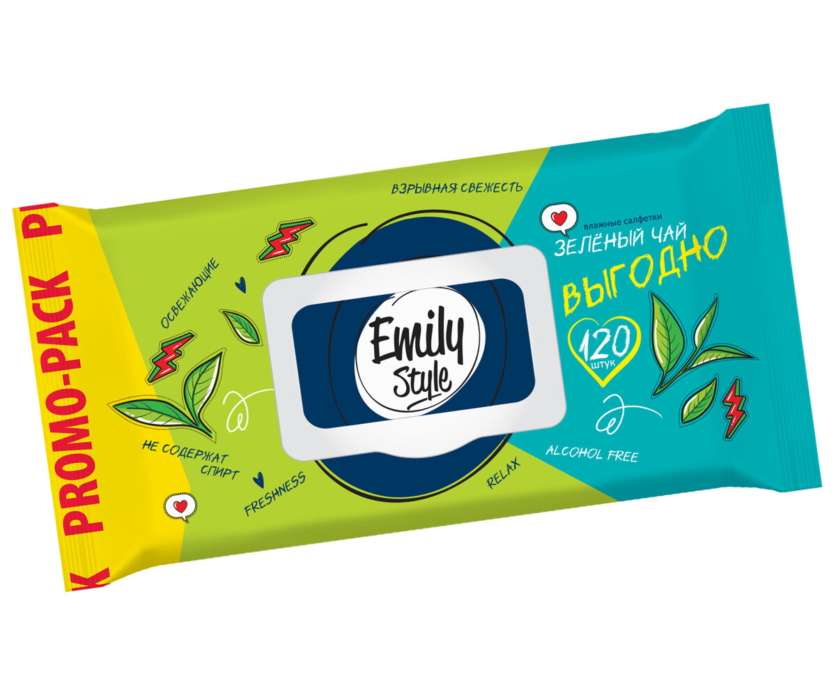 Купить Влажные Салфетки Emily Style зеленый ЧАЙ выгодно 100+20 штук упаковка с клапаном (+20% бесплатно)