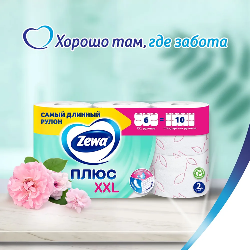 Туалетная бумага Zewa Плюс XXL Цветы, 2 слоя, 6 рулонов