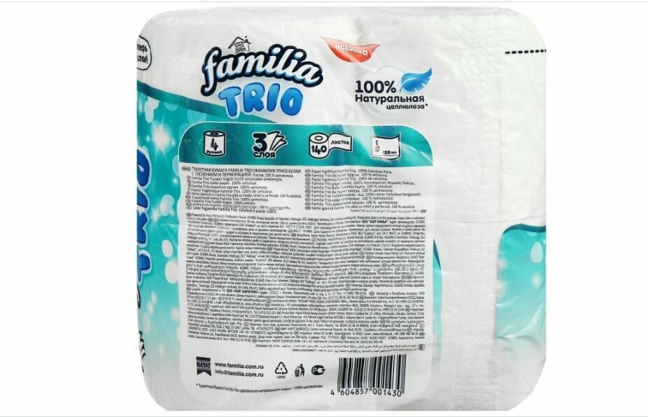 Ниже Вы можете прочитать отзывы на Familia Туалетная бумага Trio, 3 слоя, 4 шт, 2 уп, ознакомится с подробными характеристиками, посмотреть интересные обзоры и фотографии на Familia Туалетная бумага Trio, 3 слоя, 4 шт, 2 уп.