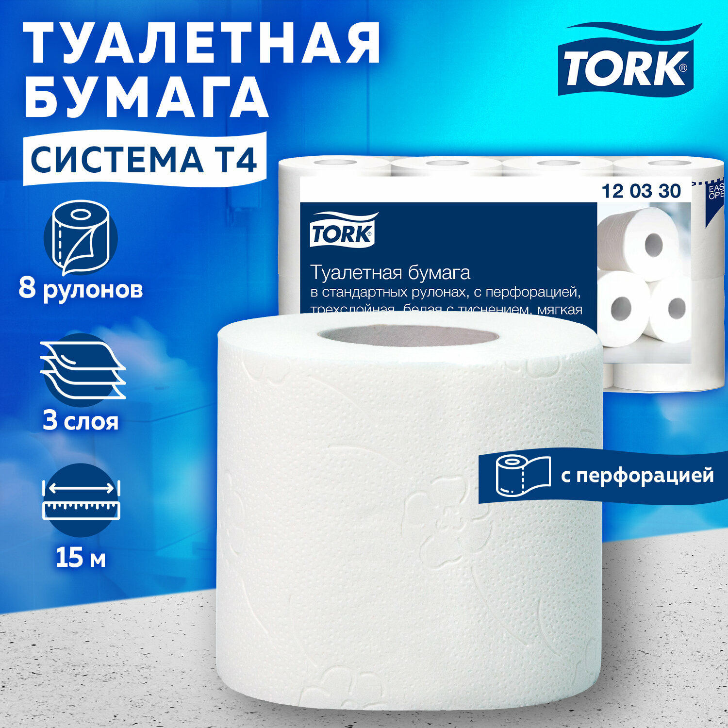 Tork туалетная бумага в стандартных рулонах ультрамягкая, категория качества Premium, 3 слойная (8 рулонов)