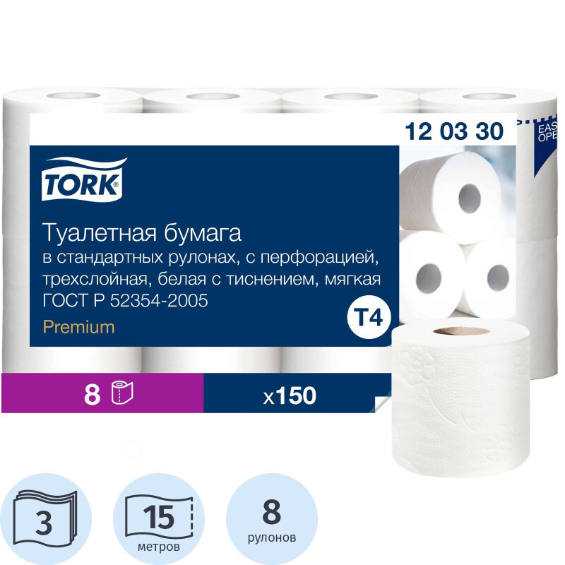 Бумага туалетная TORK PREMIUM, спайка 8 рулонов по 15 метров (Система T4) 3-слойная, белая, 120330