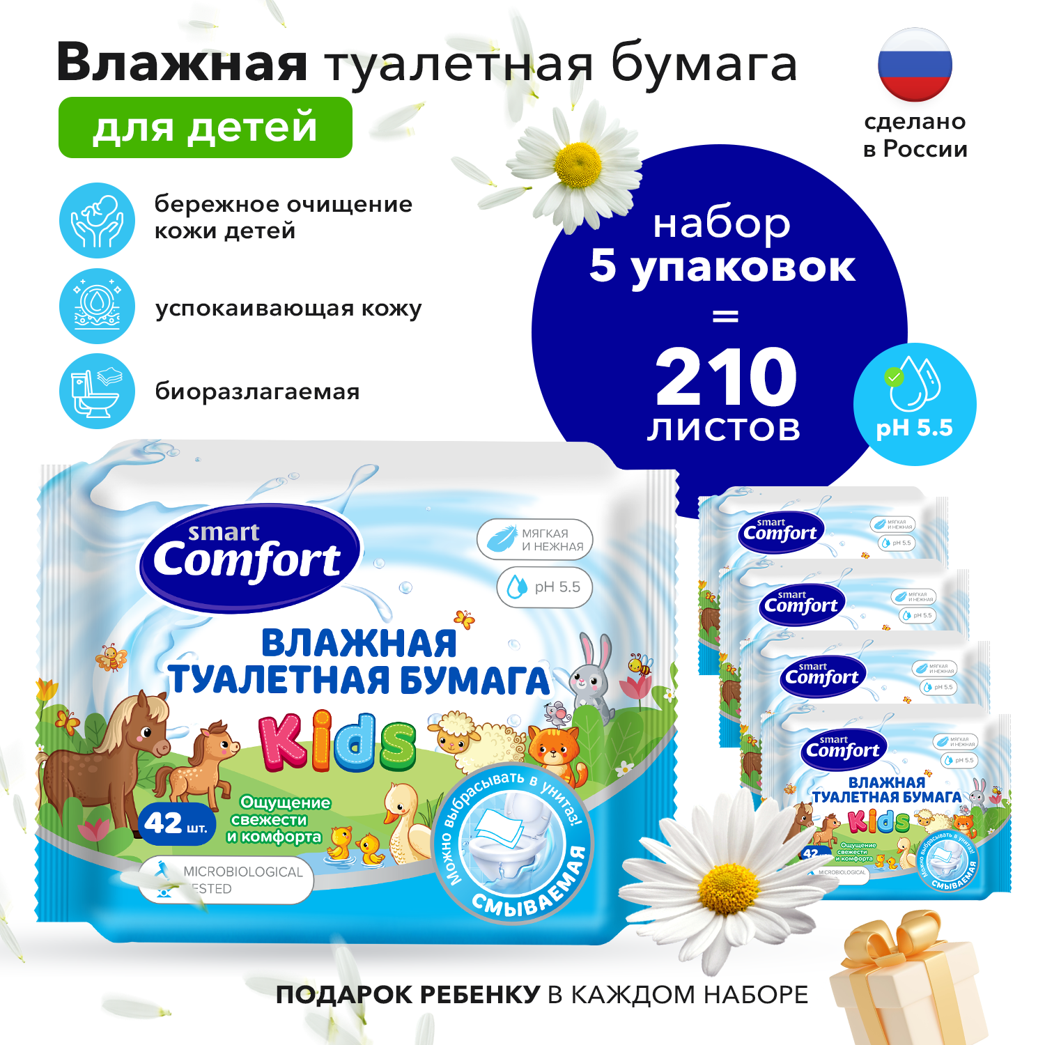 Купить Smart Comfort Kids влажная туалетная бумага для детей набор 5 упаковок + слюнявчик, смываемая туалетная бумага