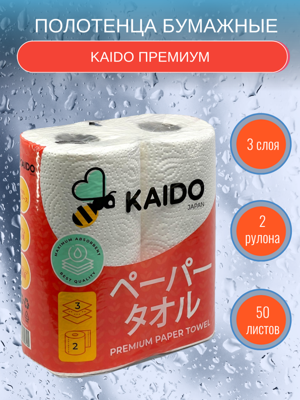 Купить Полотенца бумажные KAIDO Премиум белые, 3 слоя, 2 рулона, 50 листов