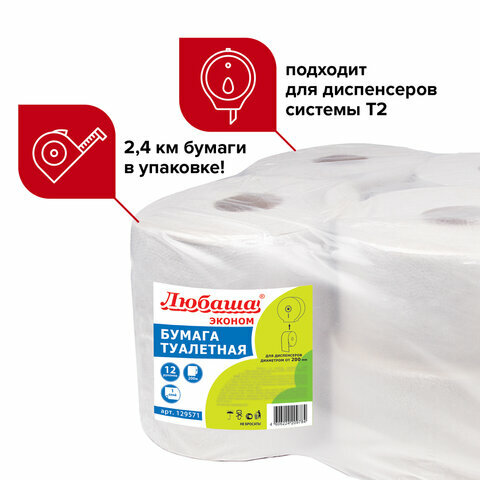 Бумага туалетная любаша (Система T2) 1-слойная 12 рулонов по 200 метров, цвет серый, 129571, 129571 (МП-39), в комплекте 1шт