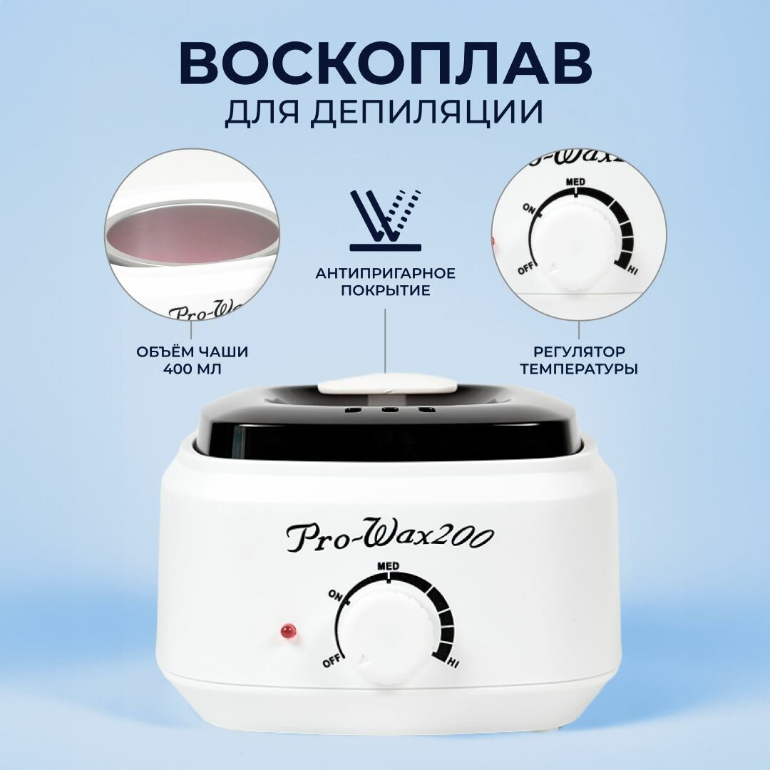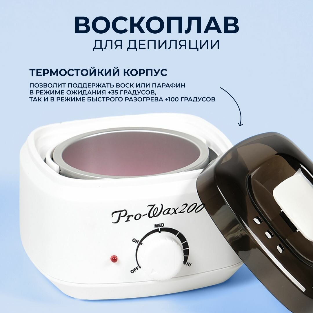 | Способ применения | Подключите к сети и наполните емкость воском. С помощью терморегулятора включите технику и поставьте на HI, лампочка должно гореть красным цветом. После 10 - 15 минут ожидания когда воск станет жидким, установите ручку управления на MED и ожидайте когда лампочка загореть синим цветом. После того, как воск приобретет равномерную консистенцию - приступайте к депиляции. ВНИМАНИЕ перед нанесением воска на кожу проверьте температуру чтобы не обжечься. |