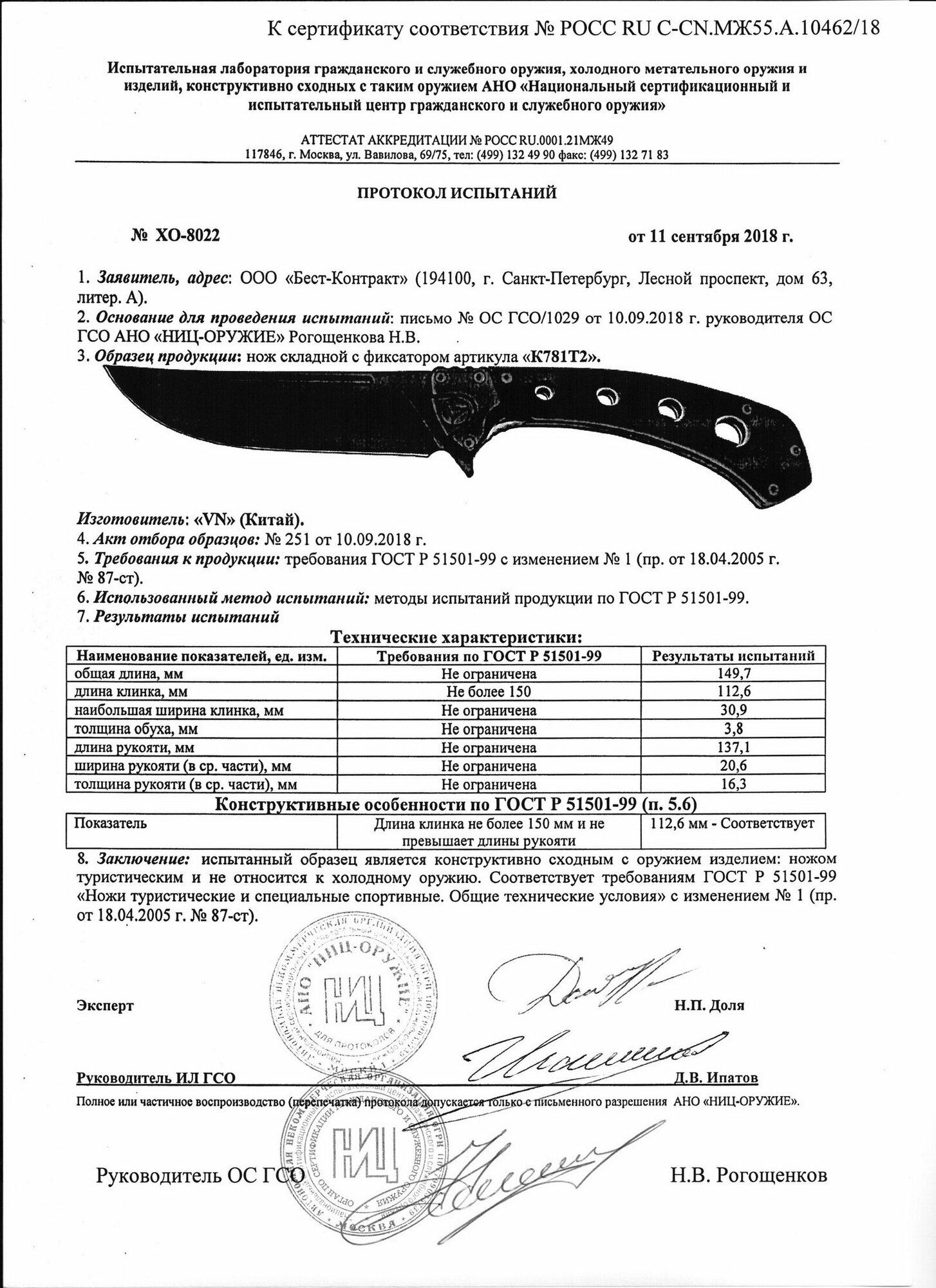 | Характеристики ножа | |