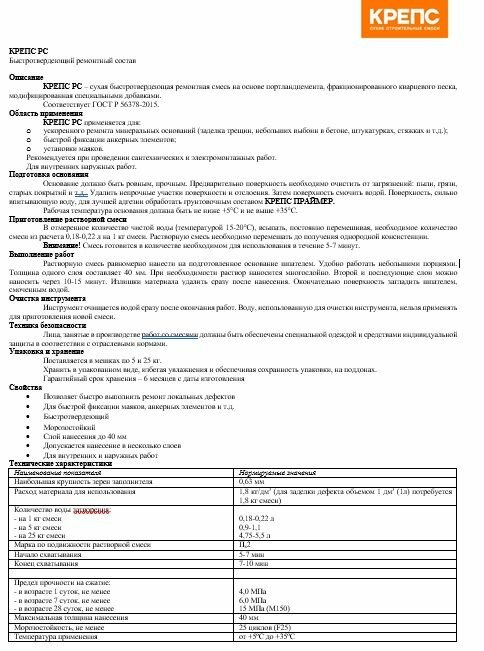 Ремонтная смесь РС "крепс" М150, F25 (5кг) интересное: