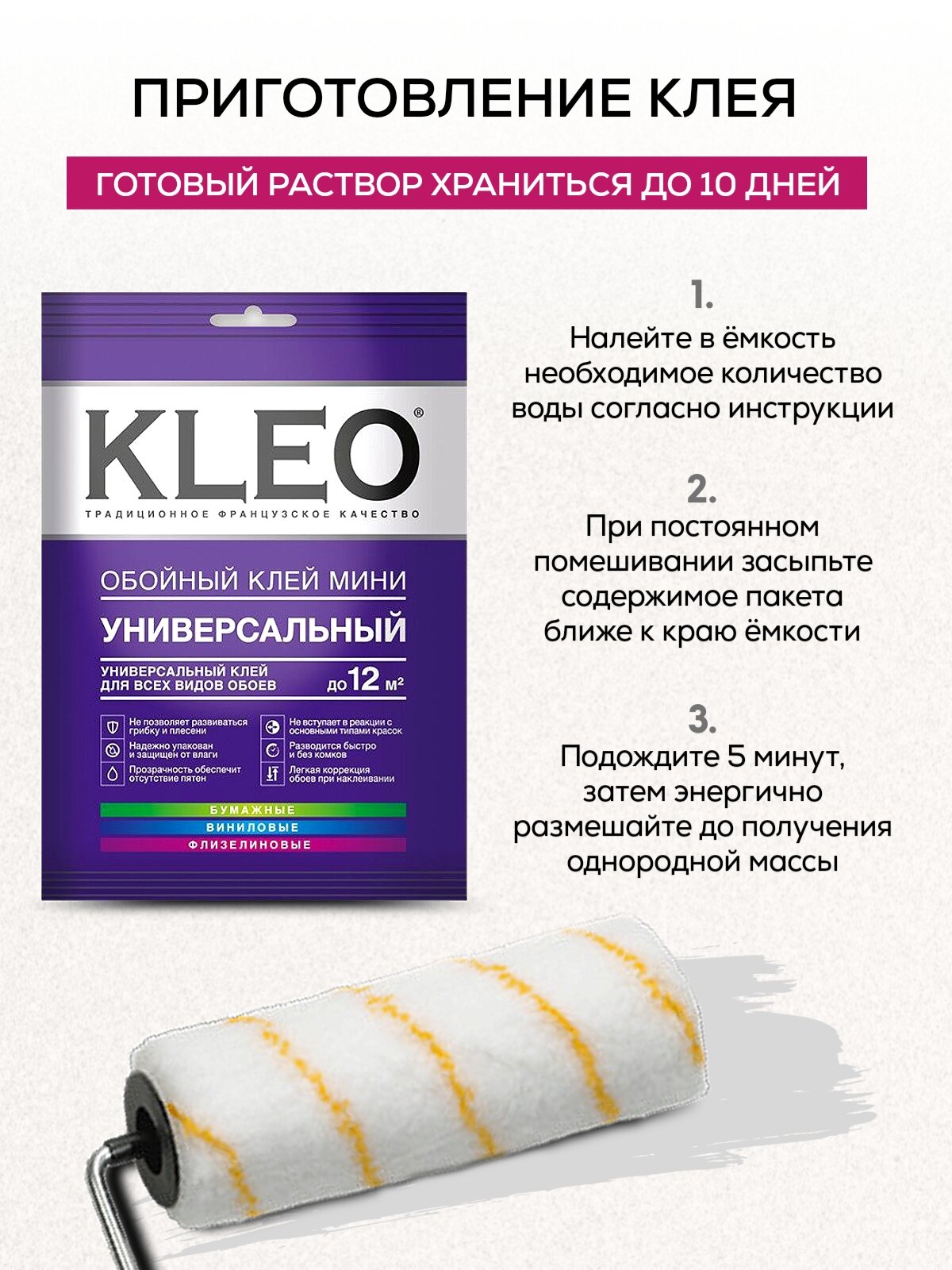 Клей для обоев KLEO MINI на 12 кв.м, обойный клей универсальный для всех видов флизелиновых, виниловых и бумажных обоев 60г. интересное: