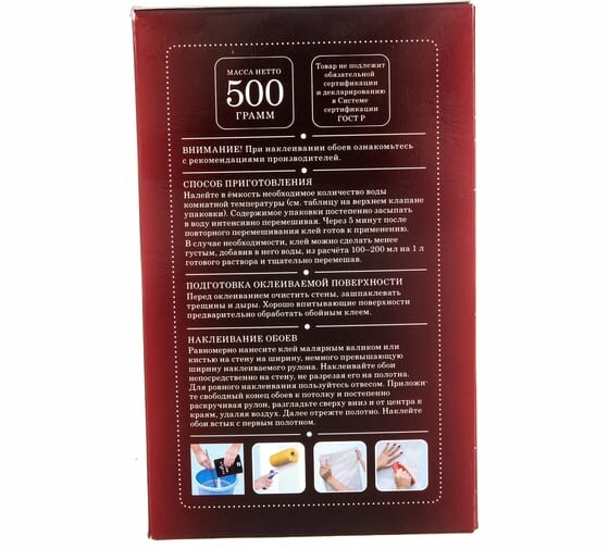 | Расход | Обработка оклеиваемой поверхности (грунтование): 60 кв.м - 8 л воды. Стеклообои: 20-25 кв.м - 4 л воды. Любые виды тяжелых обоев: 30-40 кв.м - 5 л воды |