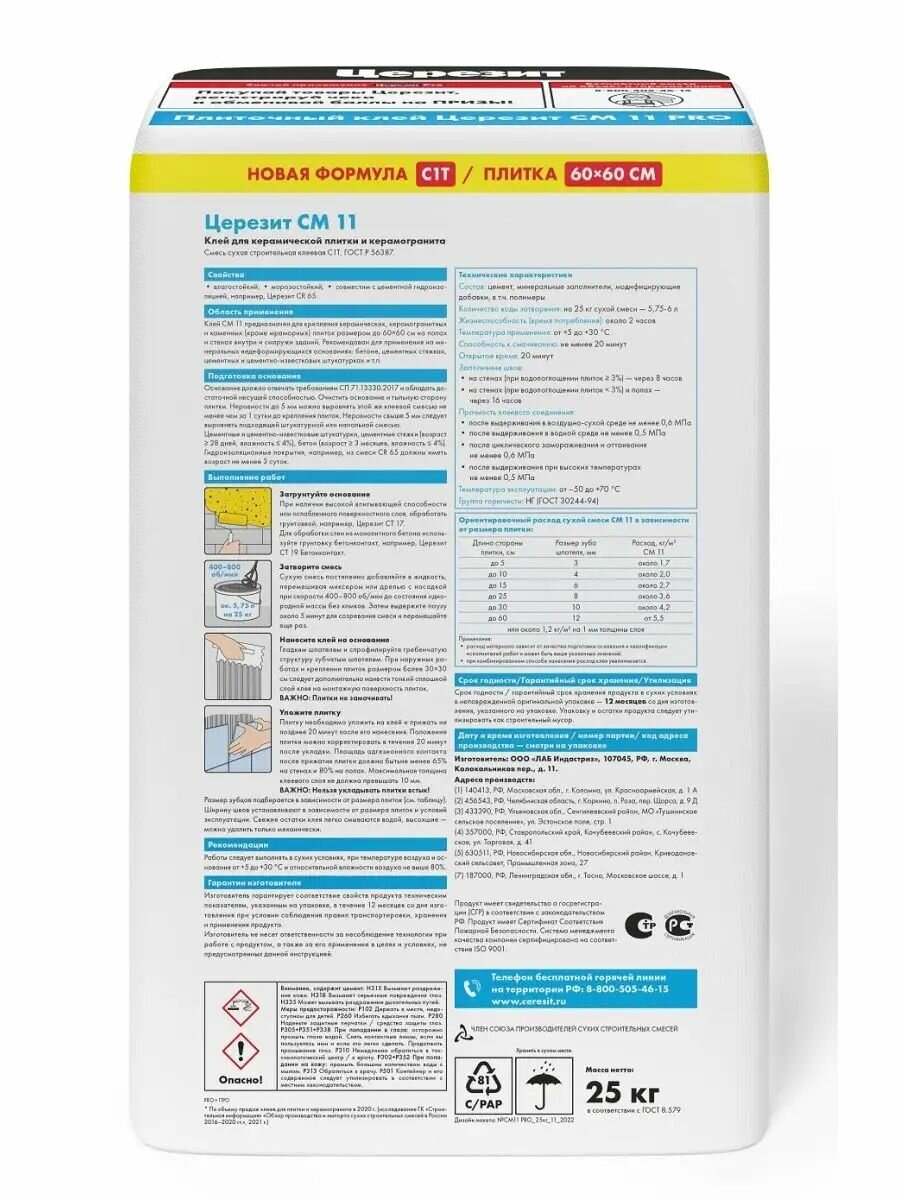 Клей СМ11 PRO для плитки, церезит - 25 кг. интересное:
