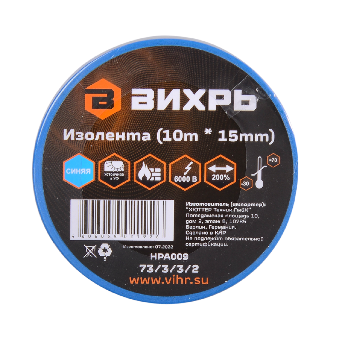 Изолента (10m * 15mm) синяя Вихрь