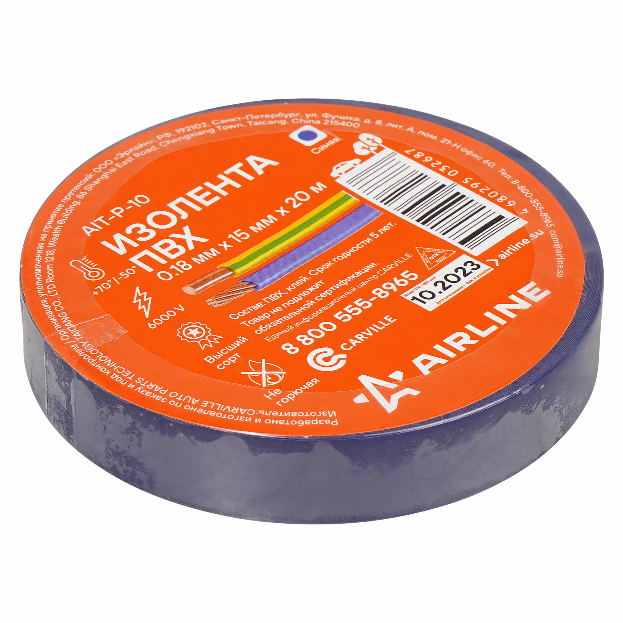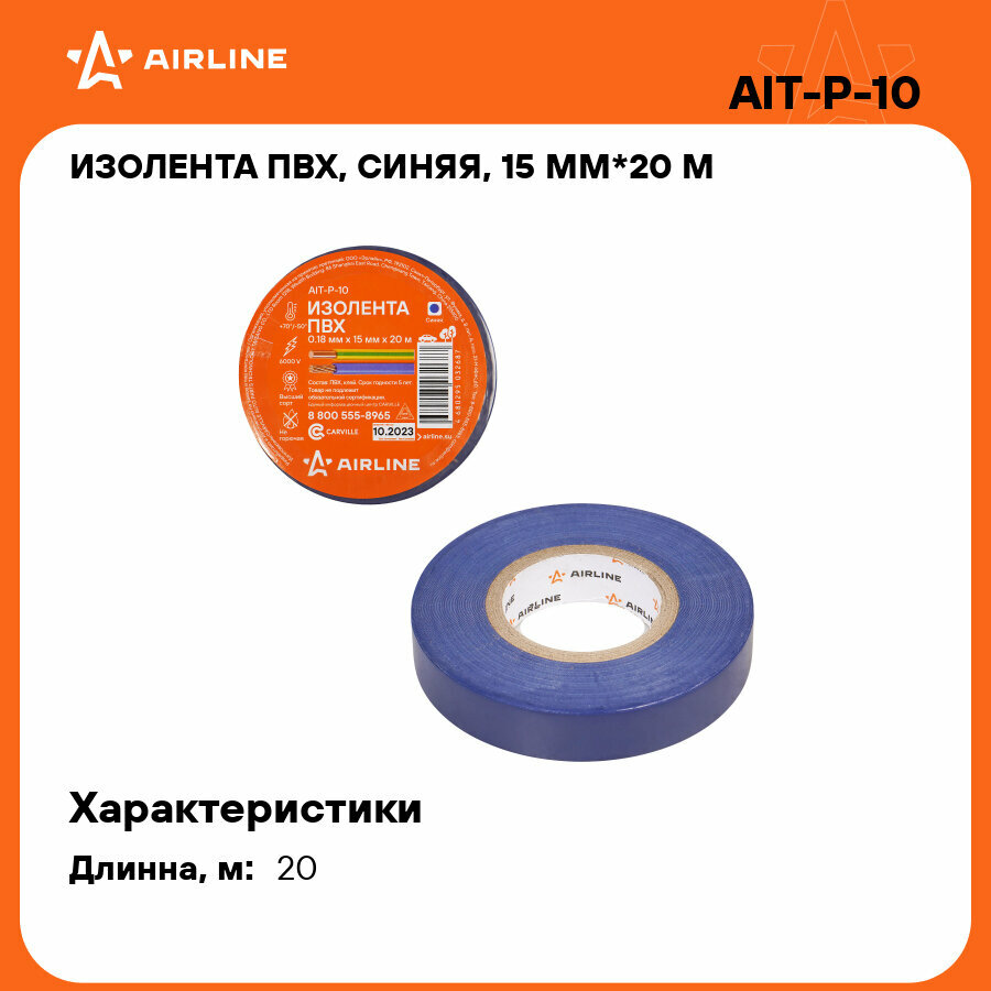 Изолента ПВХ, синяя, 15 мм*20 м (AIT-P-10), Airline, 1 шт