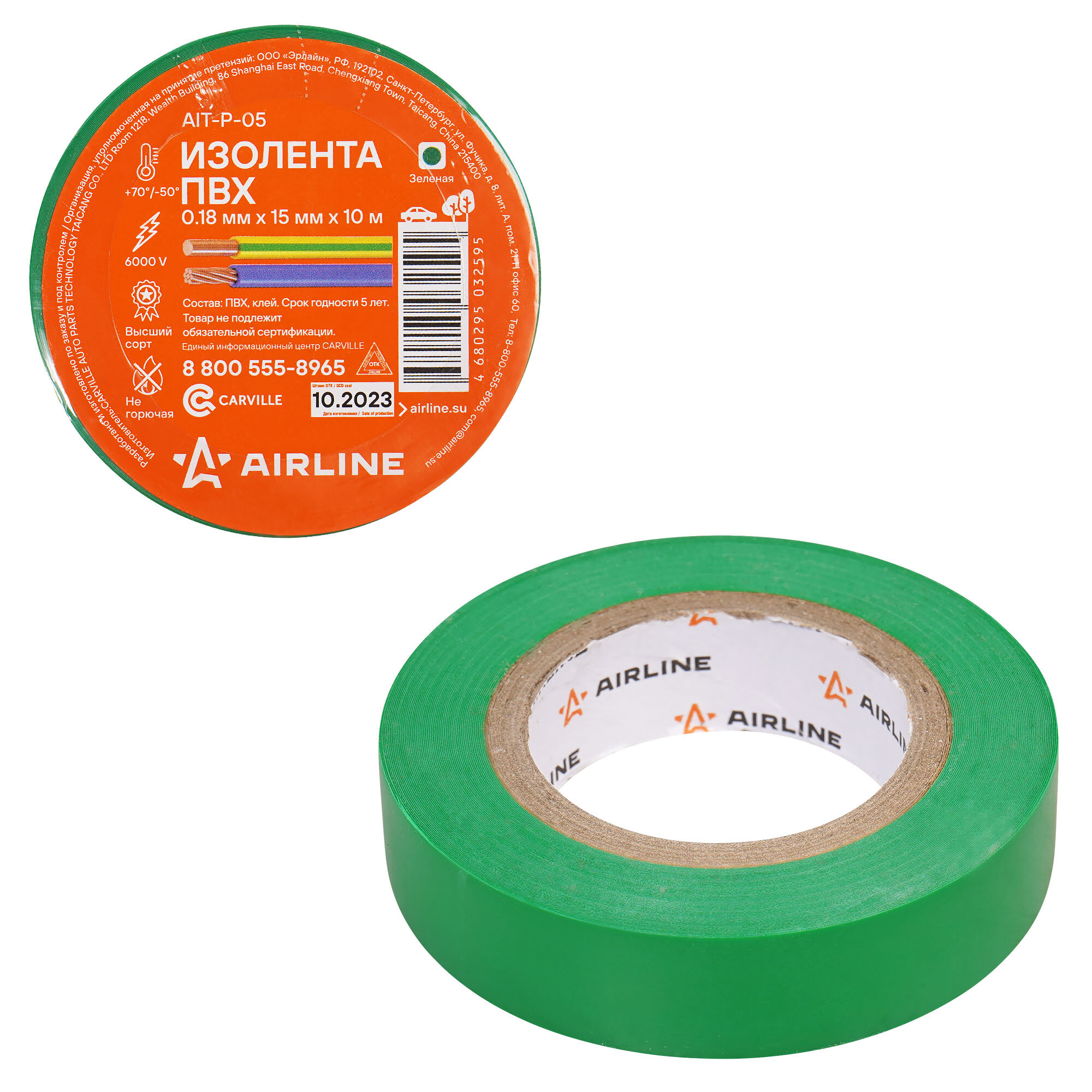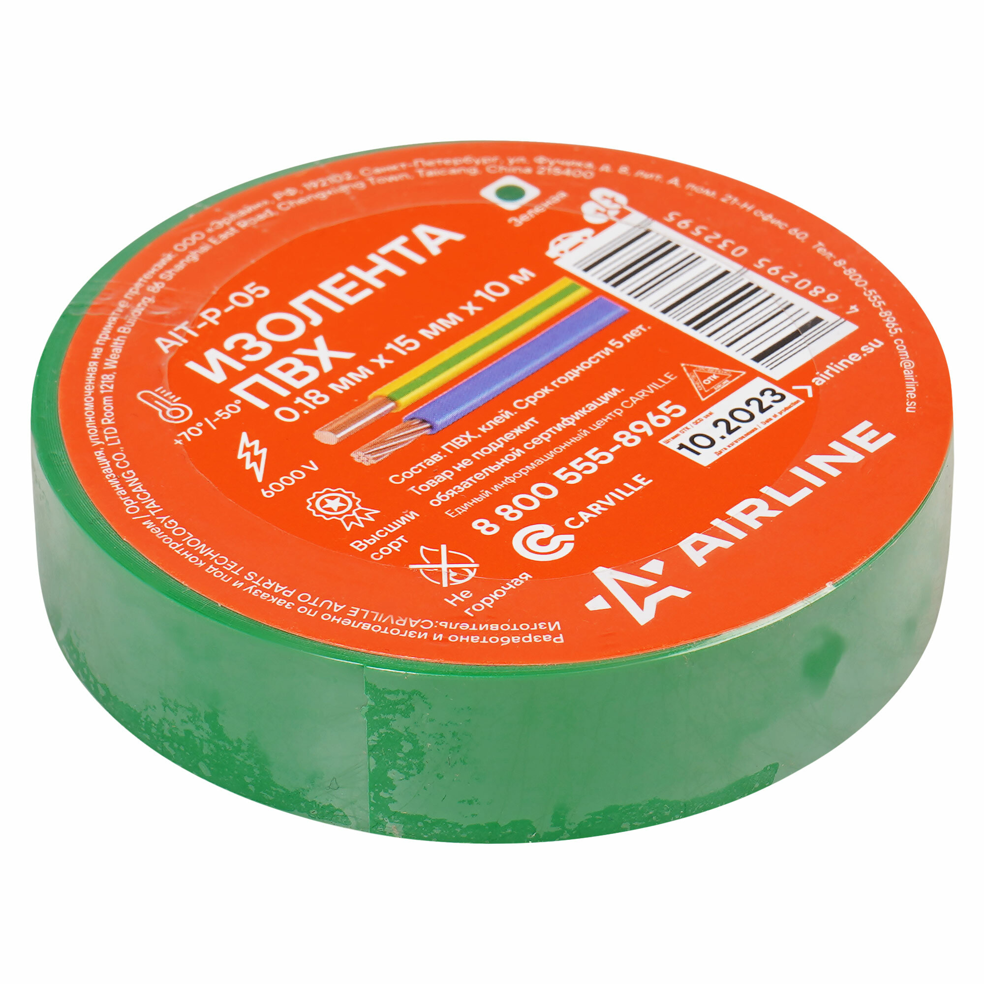 Изолента ПВХ, зеленая, 15 мм*10 м (AIT-P-05), Airline, 1 шт