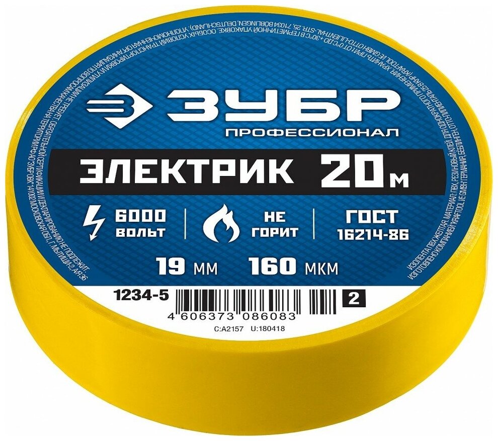 СохранитьЗУБР ЭЛЕКТРИК-20, 19 мм х 20 м, 6 000 В, желтая, не поддерживает горение, изолента ПВХ, Профессионал (1234-5) интересное: