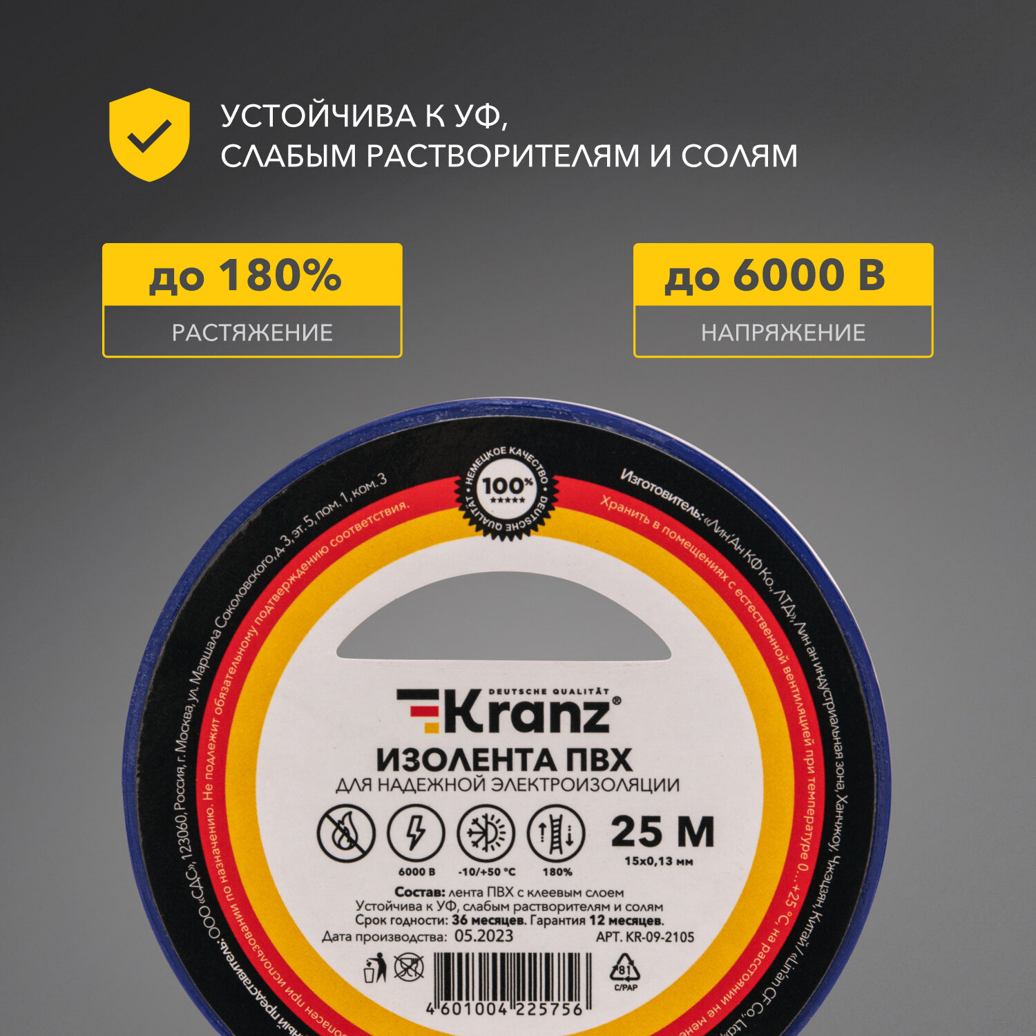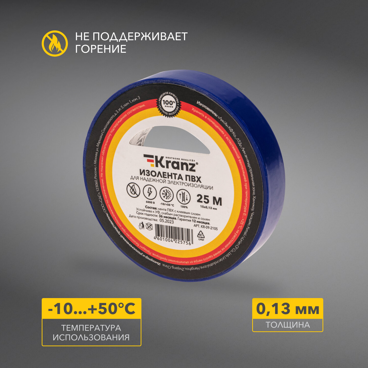Изолента ПВХ KRANZ 0.13х19 мм, 25 м, синяя (5 шт./уп.)