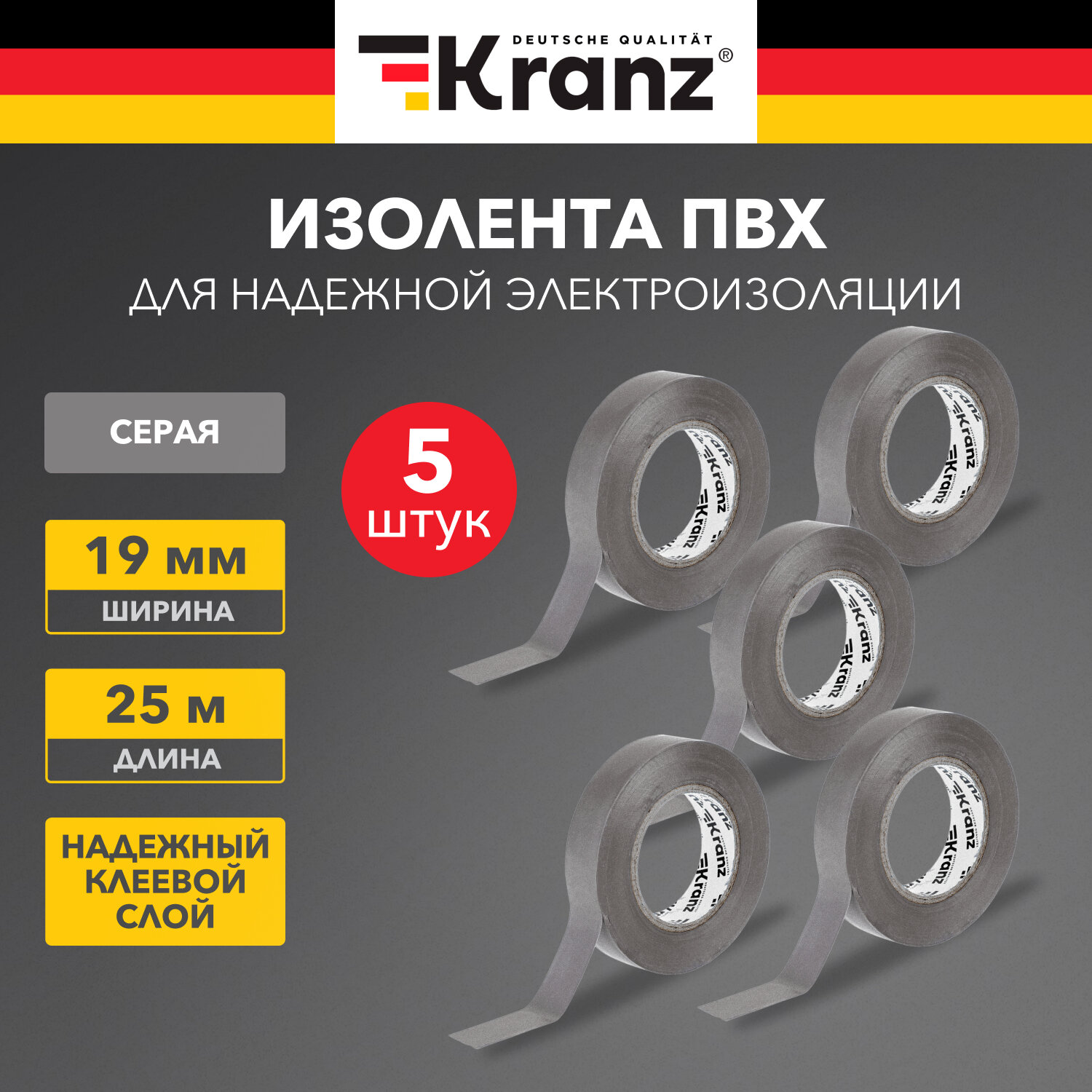 Изолента ПВХ KRANZ 0.13х19 мм, 25 м, черная Kranz KR-09-2206, KR092206 (упаковка 5 шт.), KRANZ KR-09-2206
