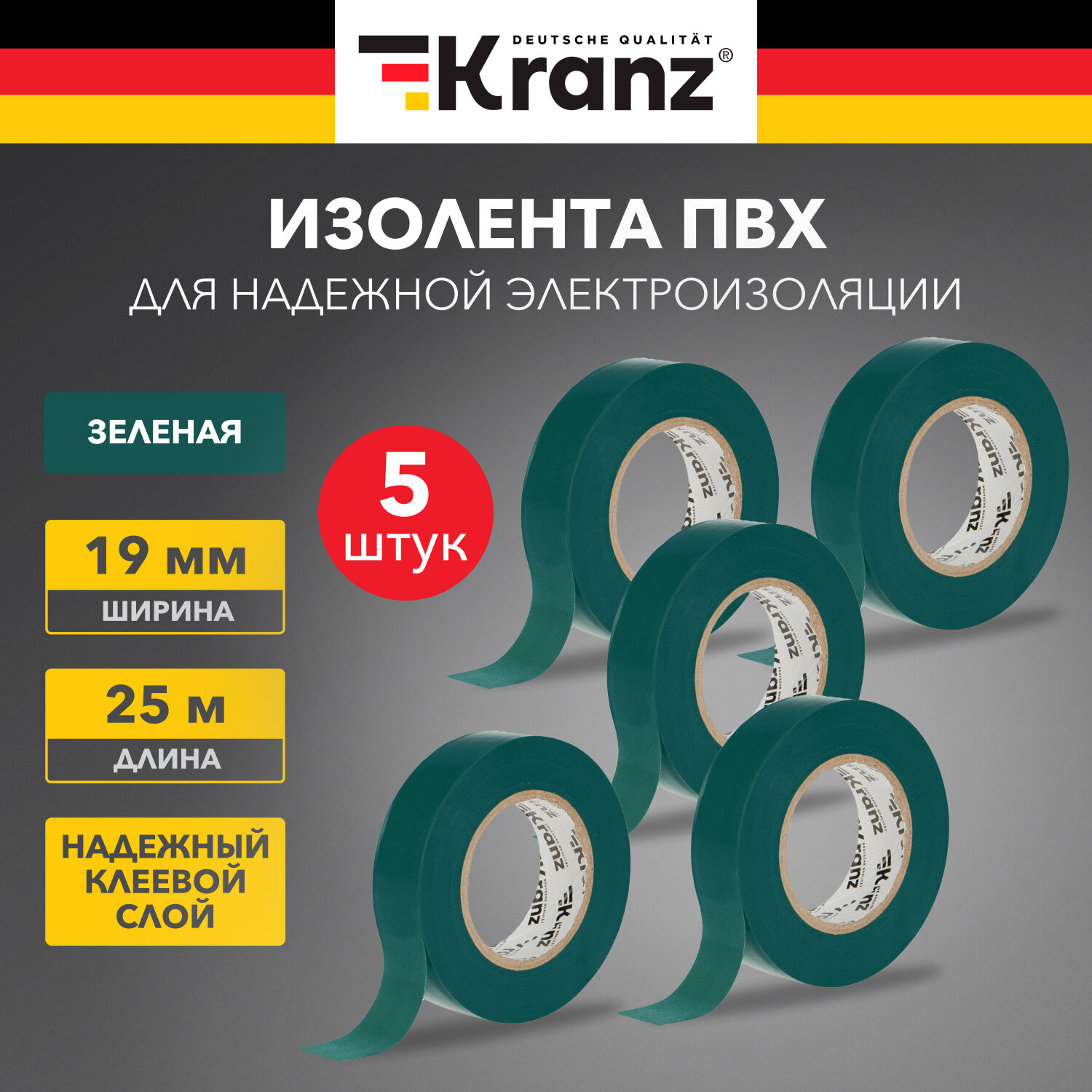 Лента Kranz электроизоляционная, изолента зеленая термостойкая из ПВХ 25 м, 5 шт