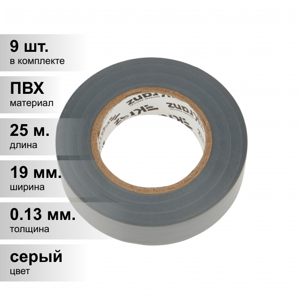 Купить (9 шт.) Изолента ПВХ серая 19мм 25м ПВХ 0,13 KRANZ (5 шт./уп.)