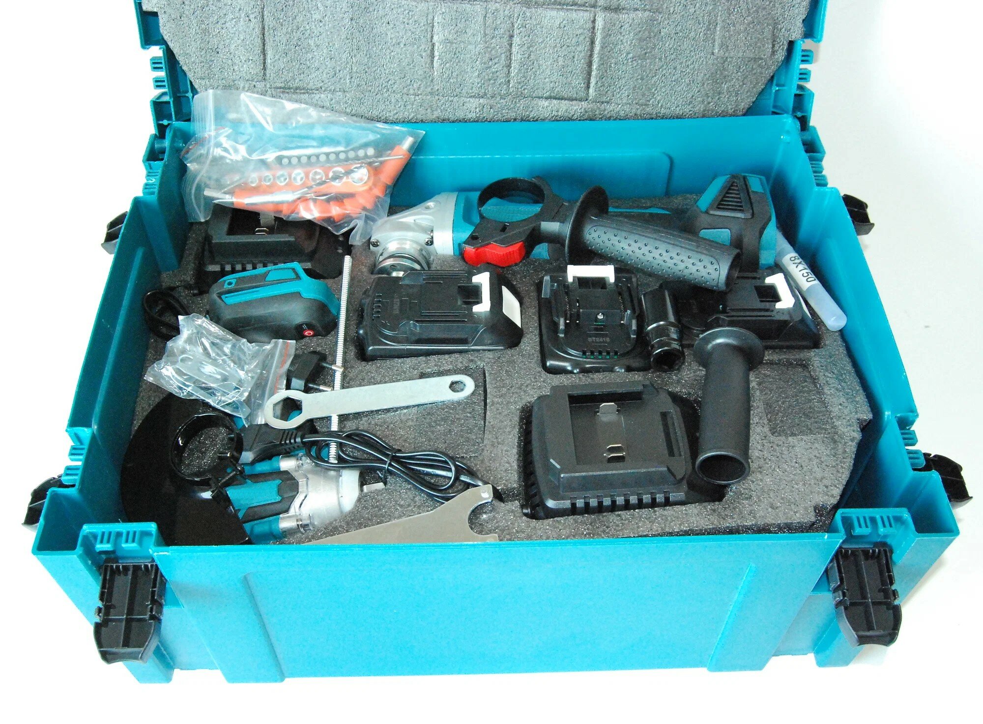 | Состав (подробно) | Перфоратор, гайковерт, шуруповерт, болгарка, цепная пилка, циркулярная пила, сабельная пила, оснастка, 4 АКБ, 2 ЗУ. |