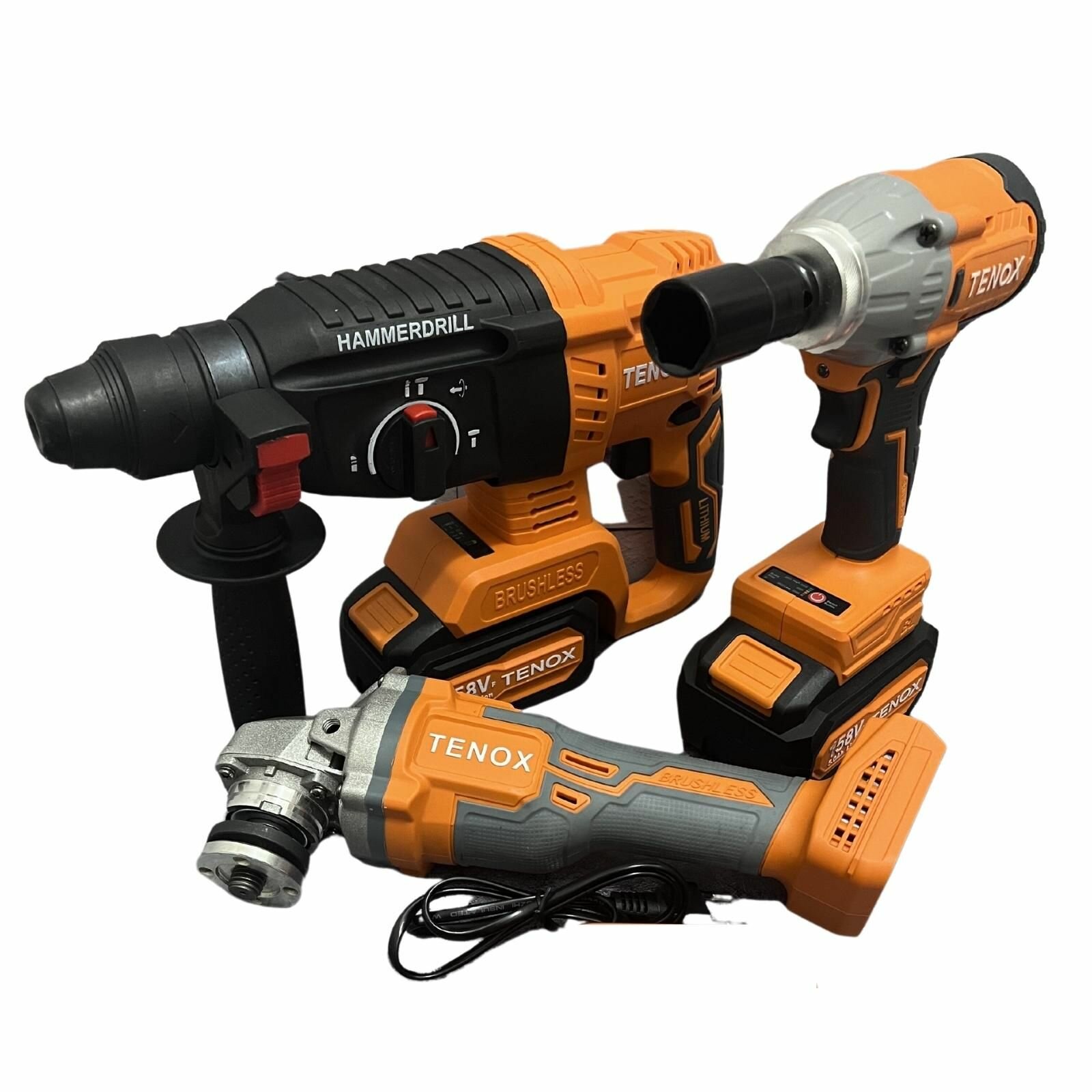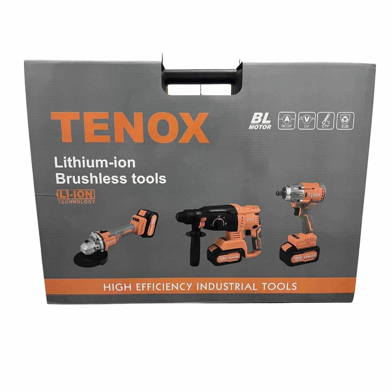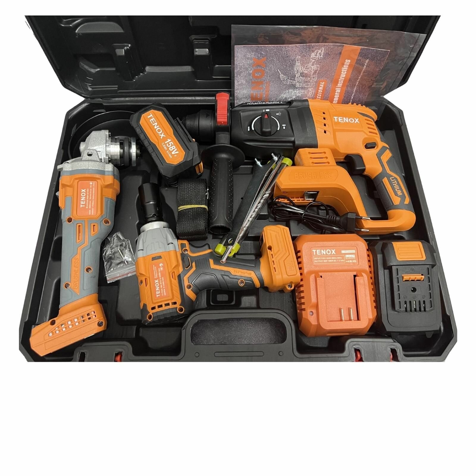 Купить TENOX 3 в 1 кейсе, Набор бесщеточных аккумуляторных инструментов перфоратор, болгарка УШМ, гайковерт, 2 АКБ LI-ION, 5 Ач