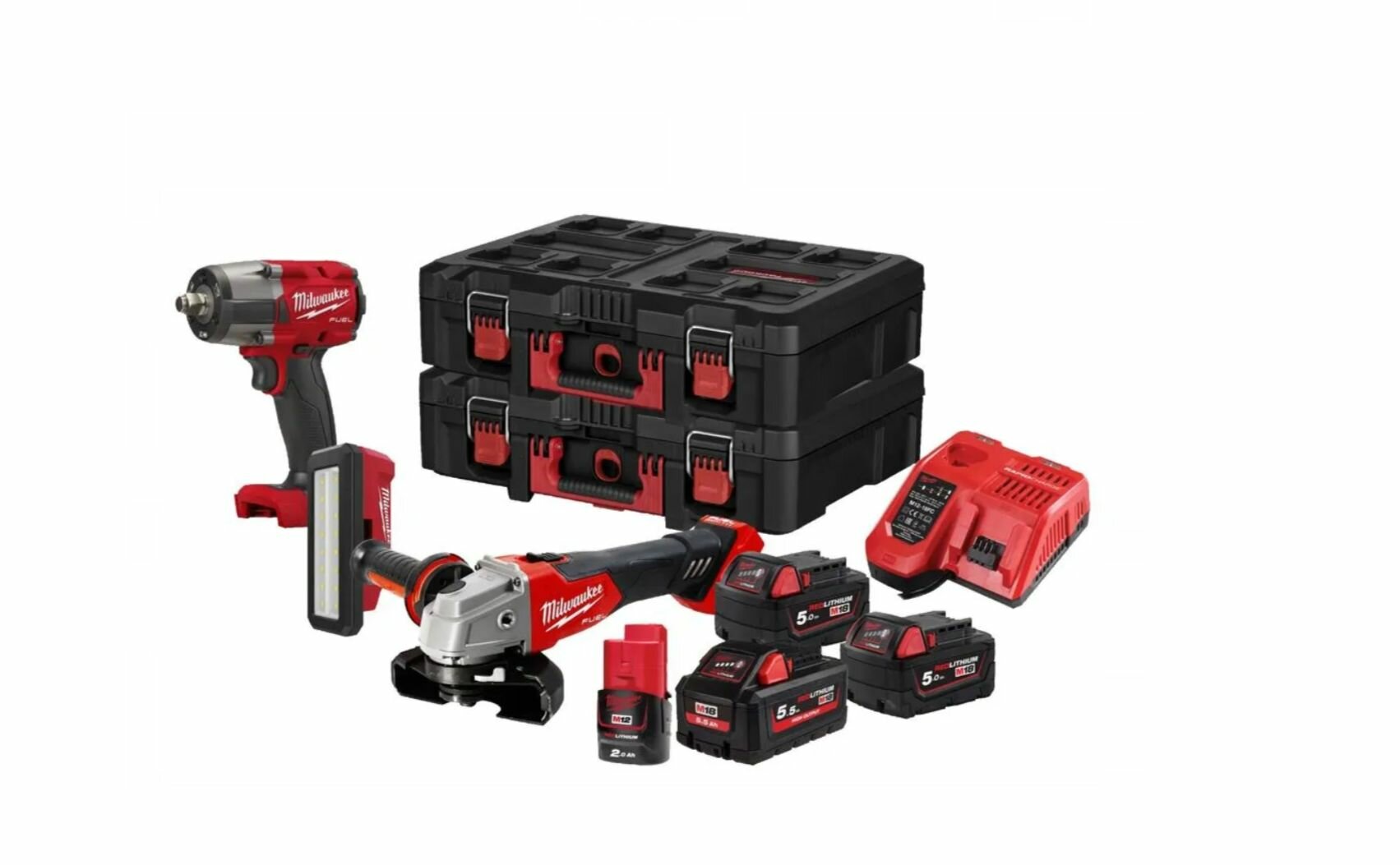 | Состав (подробно) | -Аккумуляторный гайковерт Milwaukee M18 FUEL FMTIW2F12-0 4933498057 -Угловая шлифмашина Milwaukee M18 FSAG125X-0 4933478701 -Аккумуляторный фонарь Milwaukee M12 PAL-0 4933478226 -Зарядное устройство -Аккумуляторная батарея 18В 5.5АЧ -2 аккумуляторные батареи 18В 5АЧ -Аккумуляторная батарея 12В 2АЧ -2 кейса |