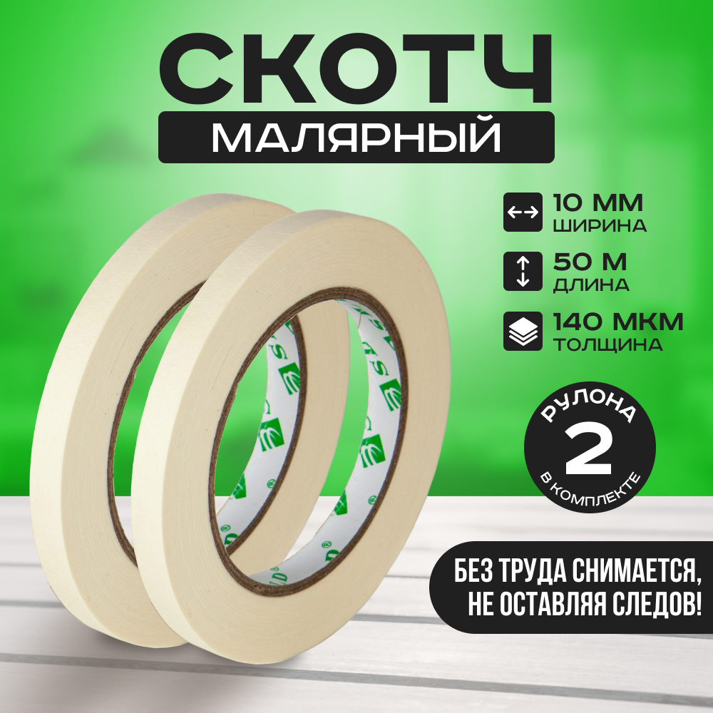 Купить Малярная лента набор 2 шт, каучуковый скотч на бумажной основе, белого цвета, клейкая для ремонта и строительства, 10мм 50м