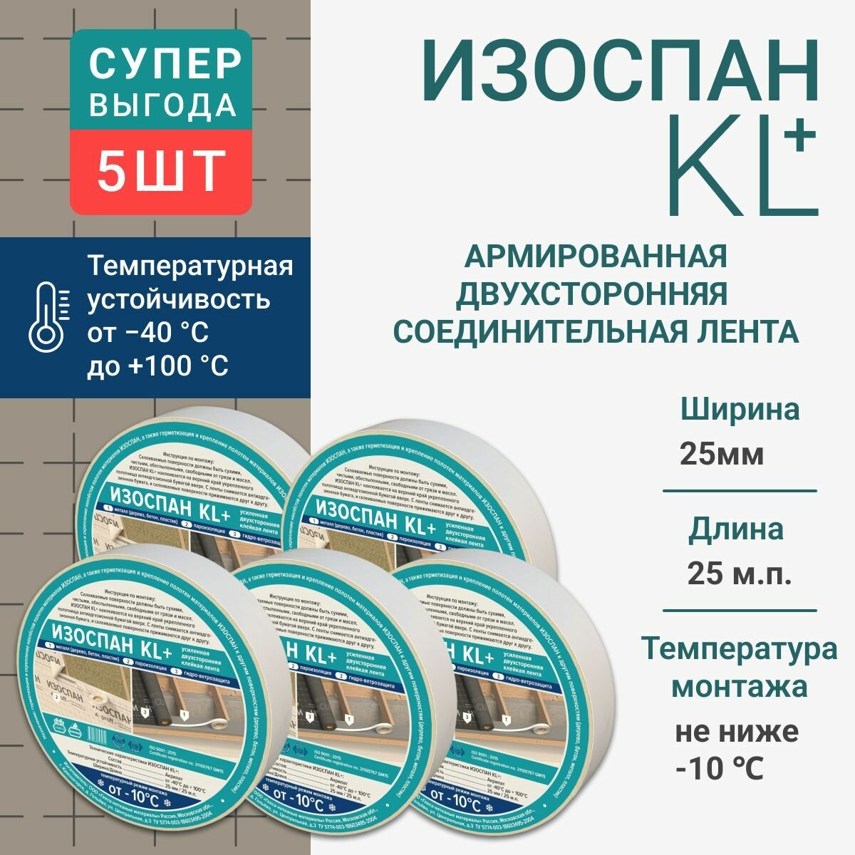 Монтажная лента Изоспан KL+ 25 мм x 25 м двусторонняя усиленная 5 шт.