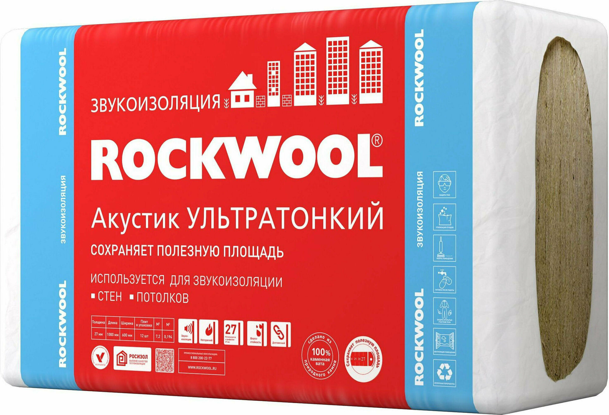 Роквул Акустик Про Ультратонкий шумоизоляция 1000х600х27мм (12шт=7,2м2=0,19м3) / ROCKWOOL Акустик Баттс Про Ультратонкий каменная вата 1000х600х27мм ( интересное: